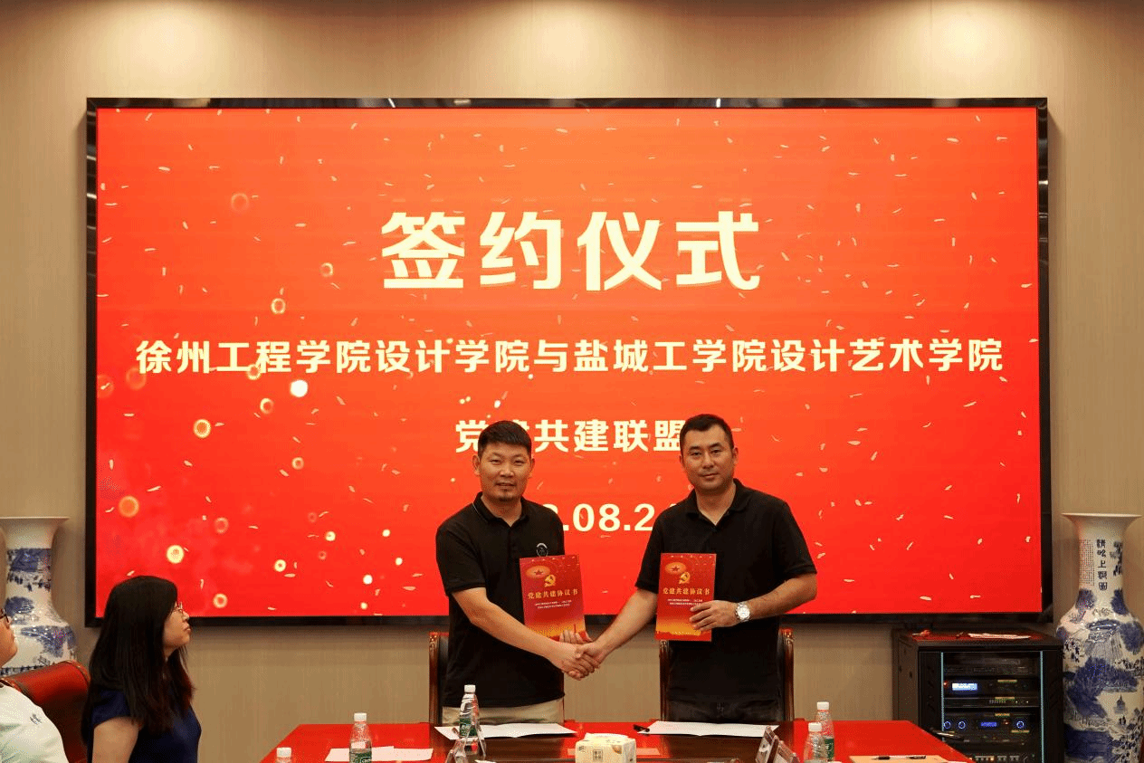 最后,我校设计艺术学院教工党支部书记钱峰与徐州工程学院设计学院教工第一、二党支部书记郑雷、冯正未,分别签订支部党建共建协议书。双方表示,将通过党建共建,促进经验交流,资源共享、优势互补,共同推动基层党支部建设全面提升,为形成可辐射、可推广的高校党建成果贡献力量。