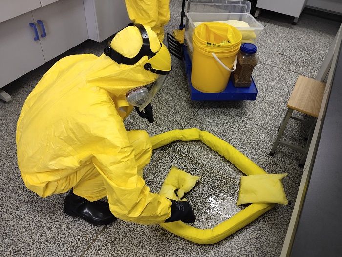 据悉,本次演练为学校第三届“实验室安全文明月”系列活动之一,由化学化工学院承办。演练模拟某实验室学生在实验过程中不慎碰倒甲苯试剂瓶,掉落地面造成甲苯泄漏事故。演练科目包括事故发生、信息报送、启动响应、应急处置等,应急处置科目设置警戒疏散、医疗救护和现场处置3个场景。本次演练准备充分、贴近实战、处置成功,达到了检验预案、锻炼队伍、磨合机制的目的。