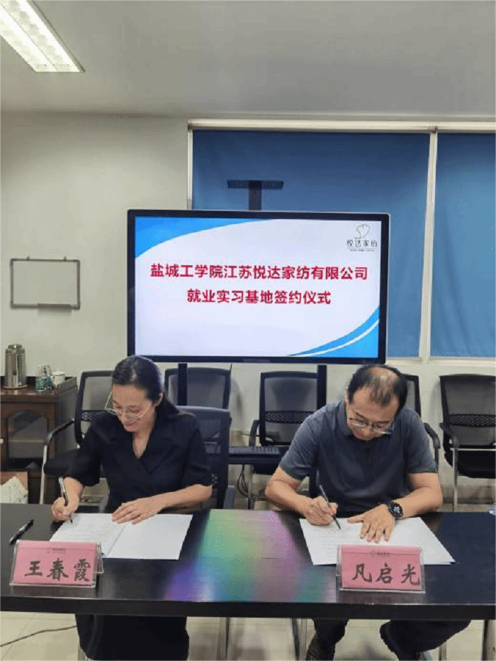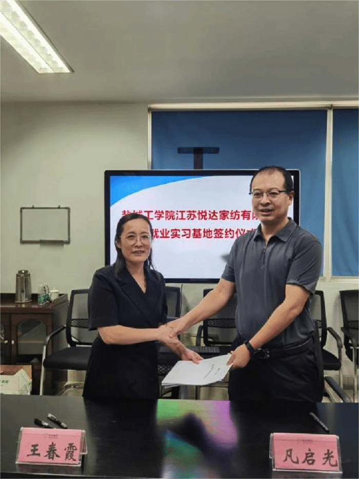 院长王春霞与江苏悦达家纺有限公司总经理凡启光作为双方代表共同签订《就业实习基地共建协议书》。