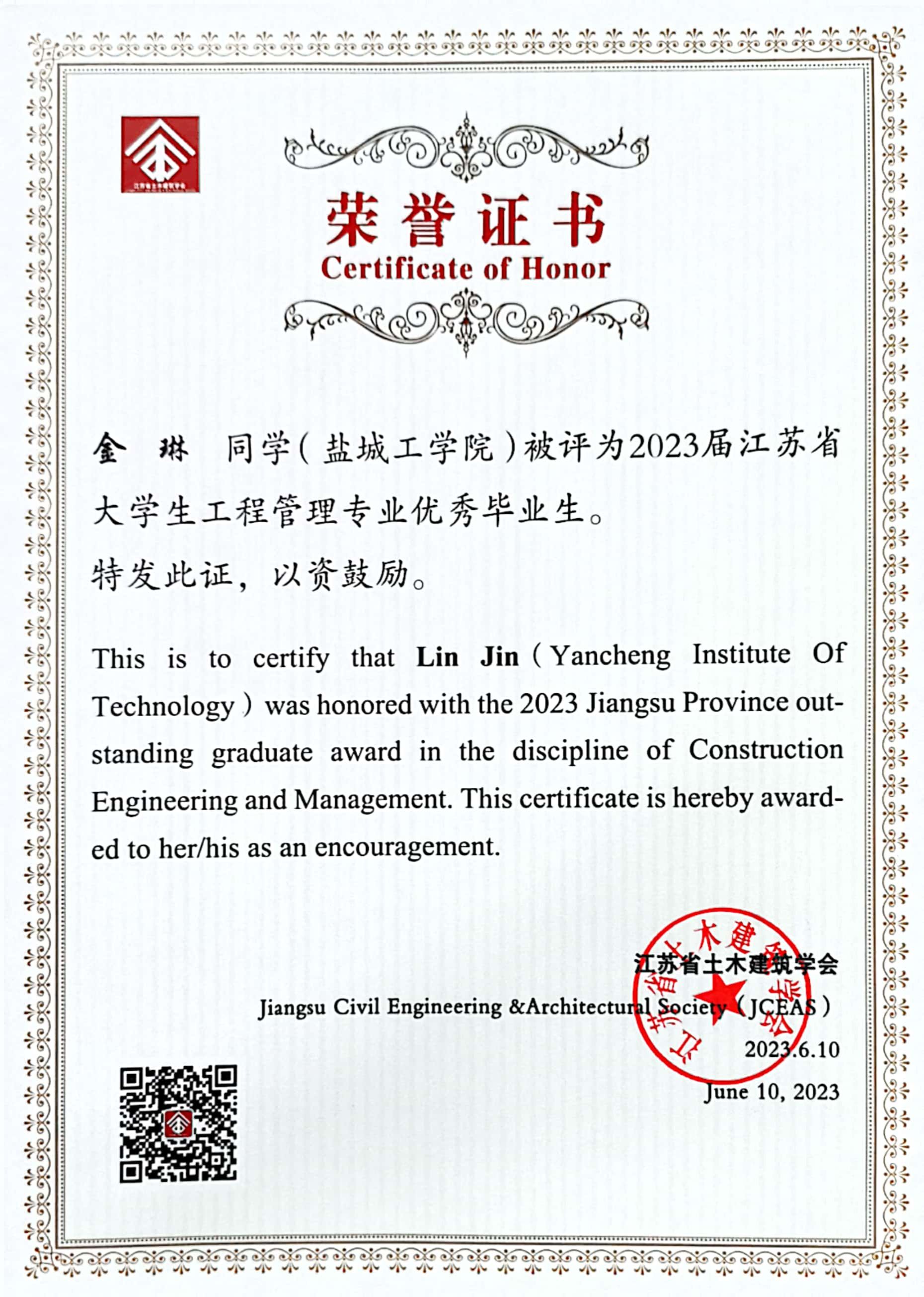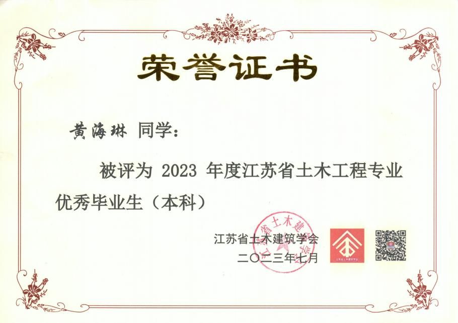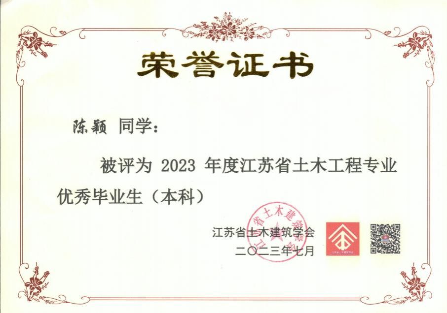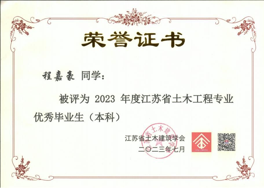 近日,从江苏省土木建筑学会传来喜讯,土木工程学院2023届本科毕业生程嘉豪、黄海琳、陈颖同学荣获“江苏省土木工程专业优秀毕业生”,金琳同学荣获“江苏省大学生工程管理专业优秀毕业生”。
