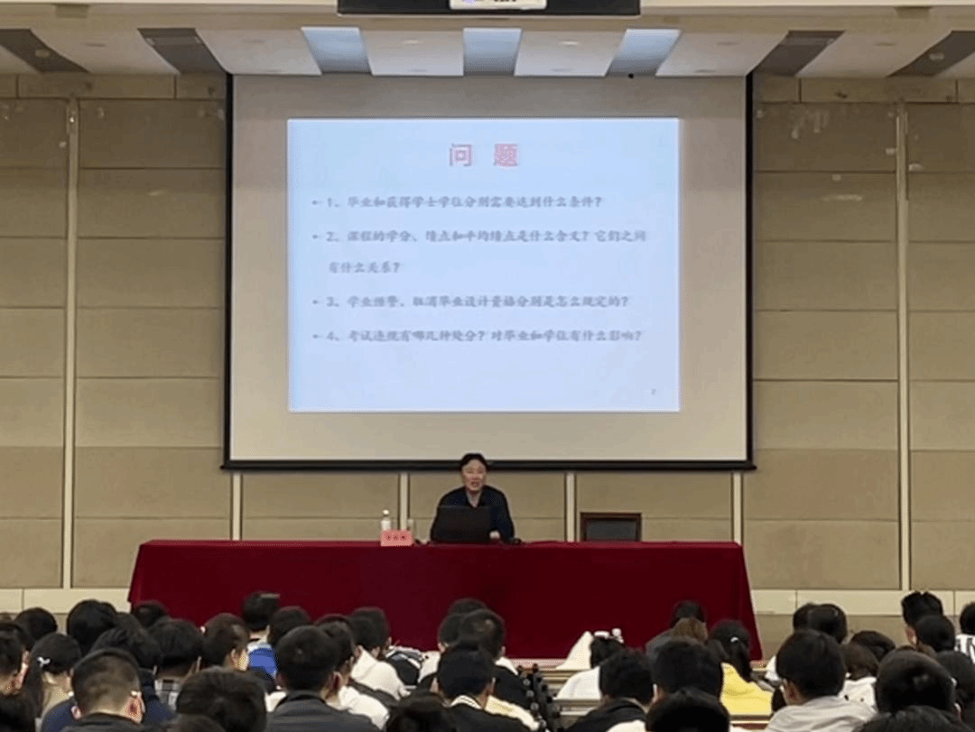 李爱国主要从学籍管理条例、毕业与学位授予条件以及学业预警与考试违纪处理办法,向同学们介绍了课程考试与成绩记载、学分绩点以及少数民族照顾政策等相关内容,并为同学们核算考试作弊需要付出的直接成本和附加成本。他寄语全体学生要诚信应对考试,珍惜大学时光,顺利完成学业。