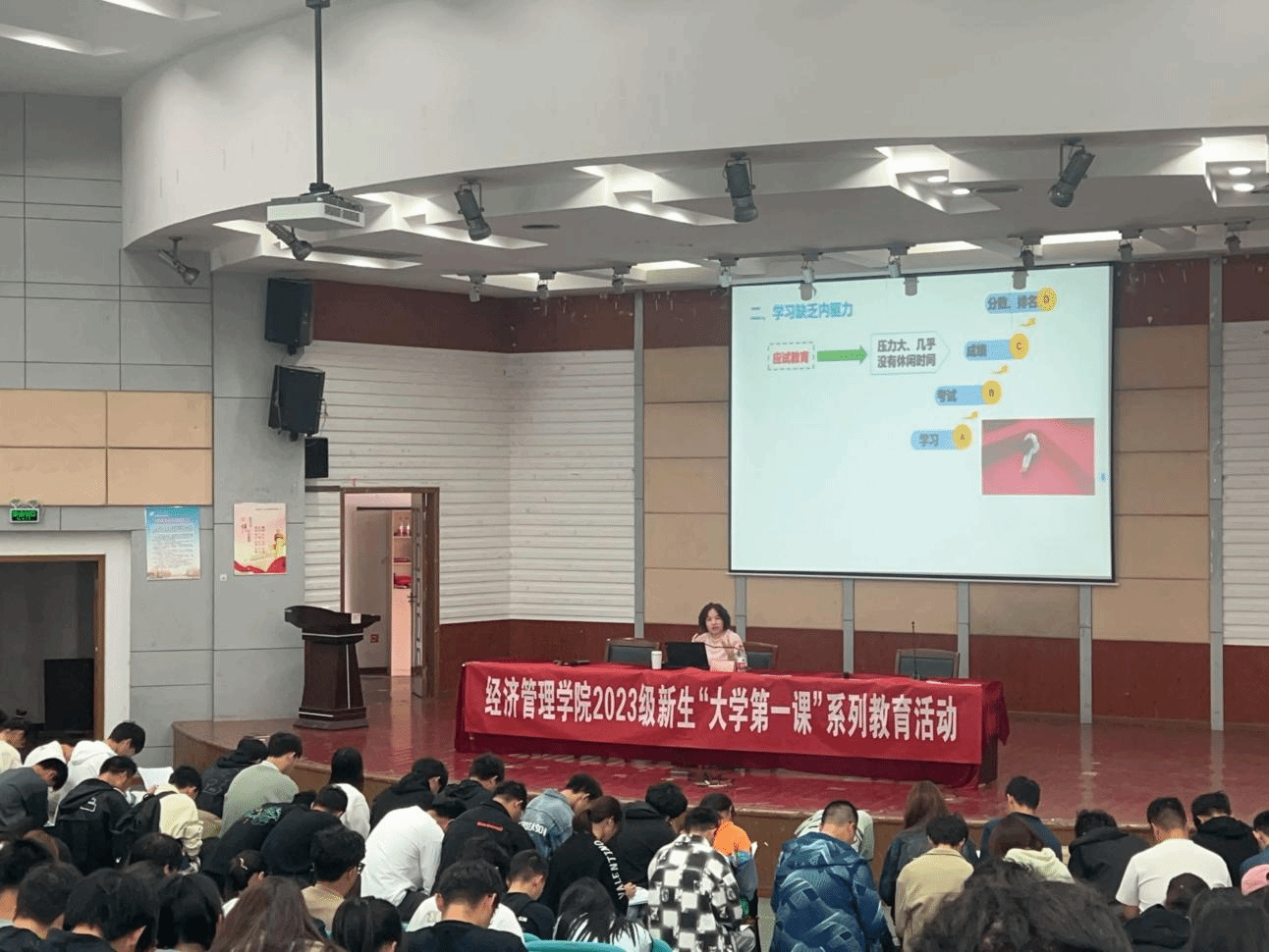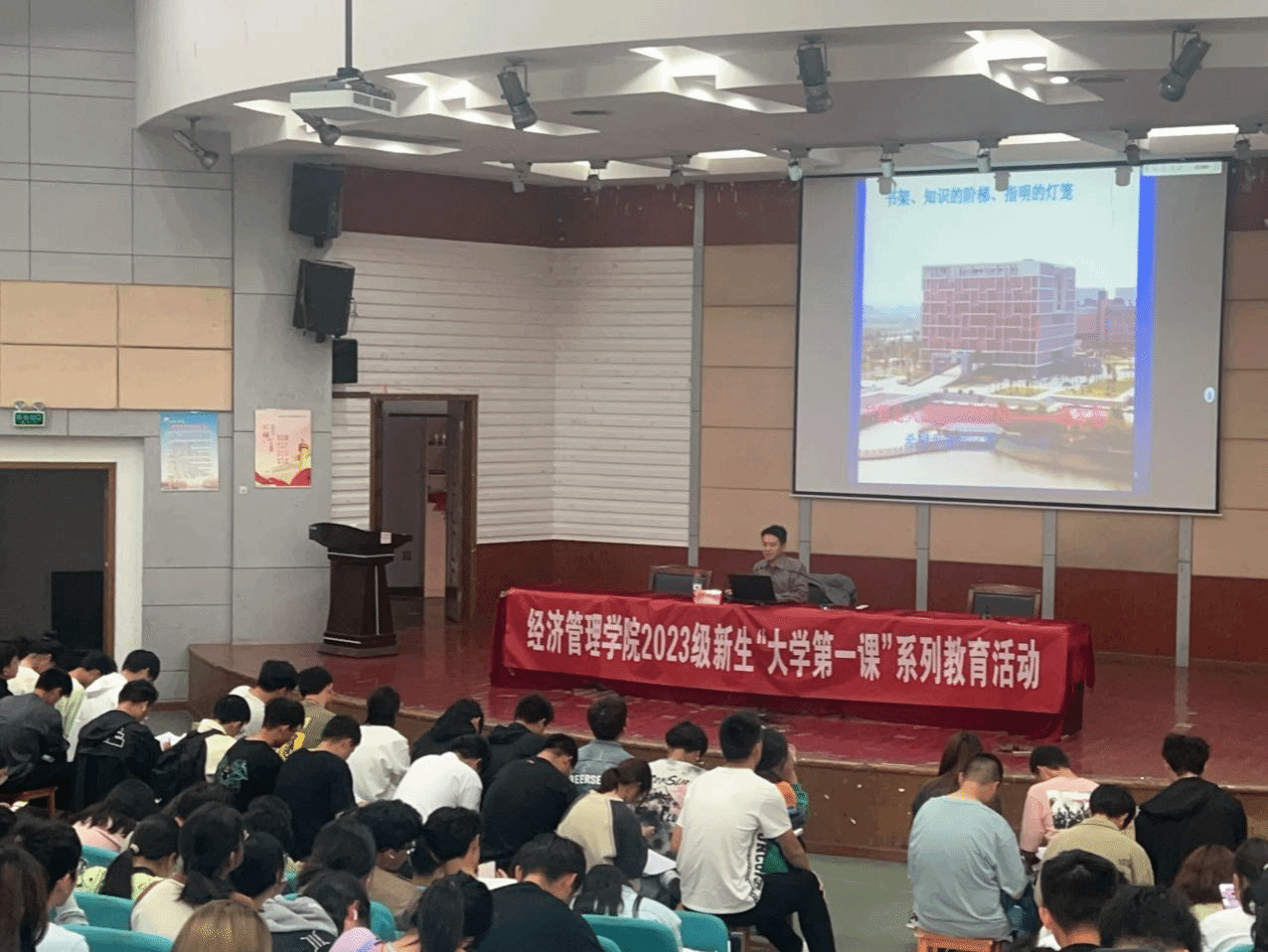 10月14日,经管学院在建军东路校区五四报告厅开展2023级新生“大学第一课”系列教育活动,切实加强新生思想引领,引导新生尽快适应校园新环境,明确学习新目标,扣好大学“第一粒扣子”,知校、爱校、荣校,立志成为可堪大用、能担重任的栋梁之才。