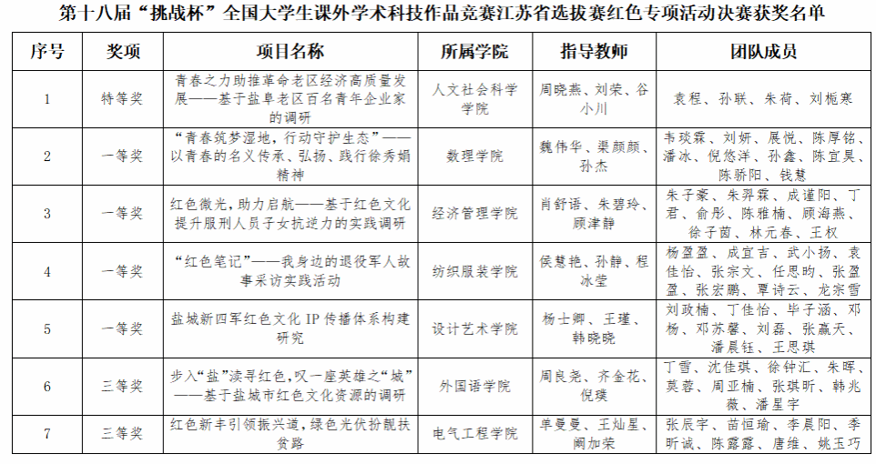 在第十八届“挑战杯”全国大学生课外学术科技作品竞赛红色专项活动江苏省选拔赛中,我校获省赛特等奖1项,一等奖4项,二等奖2项,实现了我校“挑战杯”“红色专项”活动省赛获奖等级、获奖数量的新突破。