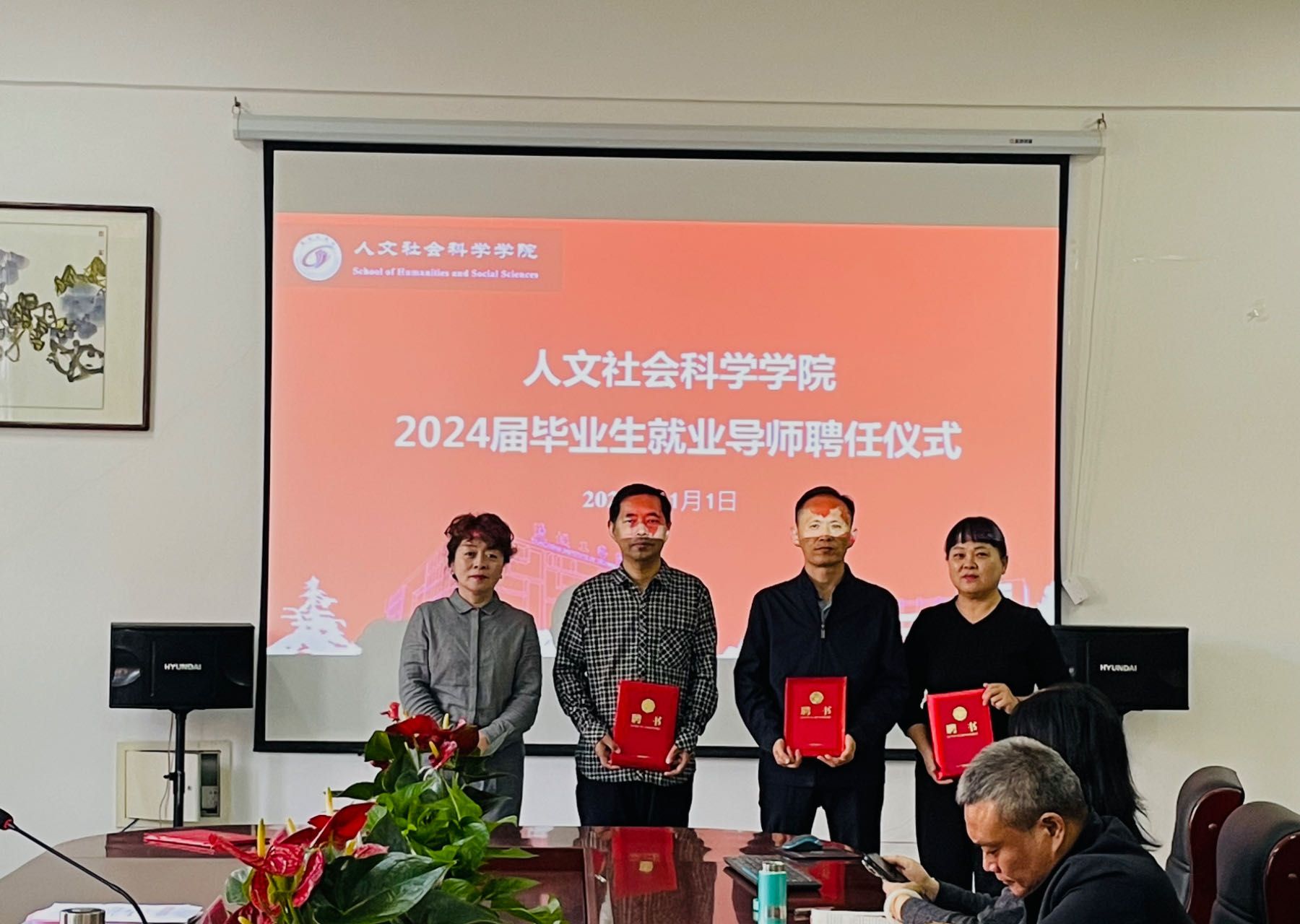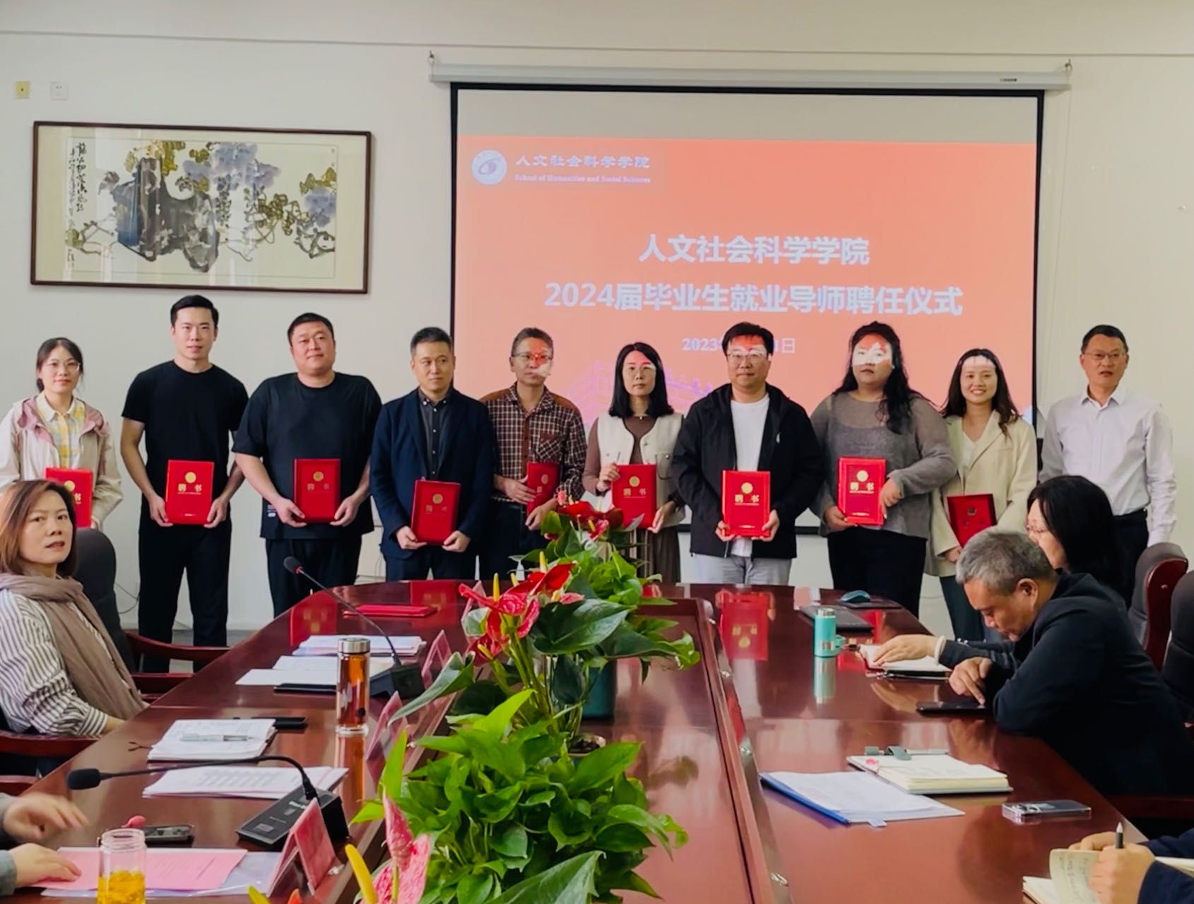 周晓燕宣读《关于聘任人文学院2024届毕业生就业导师的决定》文件。她指出,毕业生能否顺利就业是教育教学和人才培养质量的重要反映,要进一步厘清“高质量就业与充分就业”“全体教师与就业”“专业老师参与就业与辅导员参与就业”“家长与就业”之间的关系,扎实推进就业工作,力求打通人才培养输出的“最后一公里”。