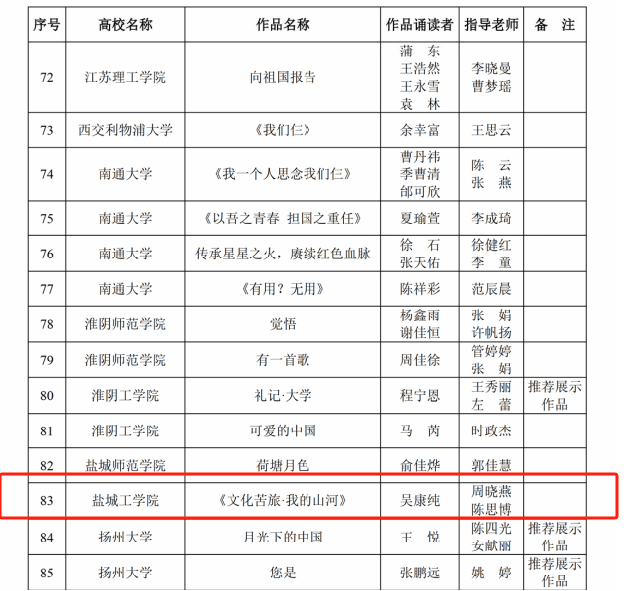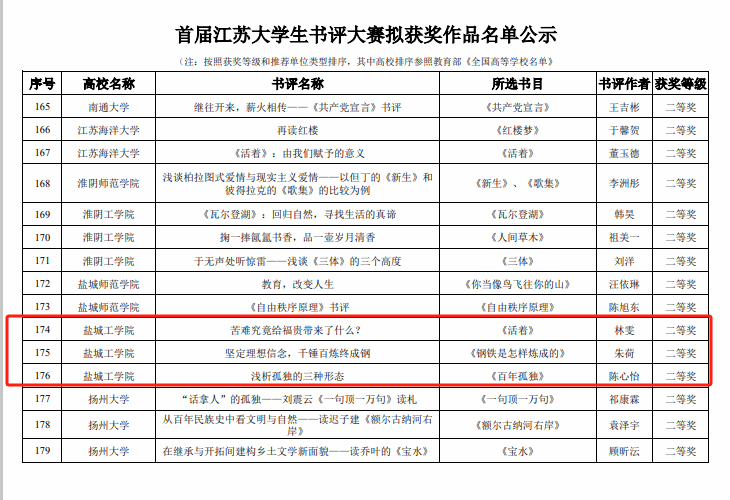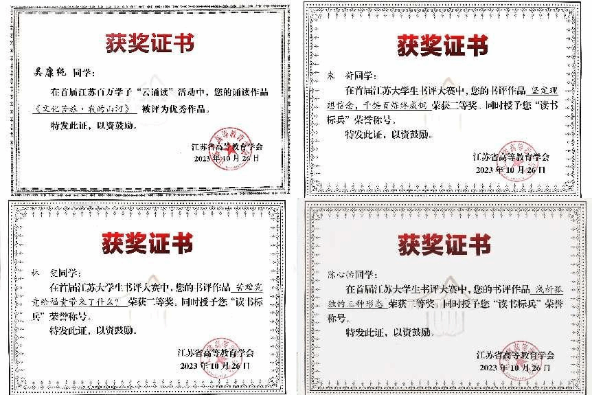 11月3日,江苏省首届大学生读书节在南京落下帷幕。我校人文社会科学学院由周晓燕、蒋继华、陈思博老师指导作品《坚定理想信念,千锤百炼终成钢》《浅析孤独的三种形态》《苦难究竟给福贵带来了什么?》荣获书评比赛二等奖,《文化苦旅˙我的山河》荣获“云诵读”活动优秀作品奖。
