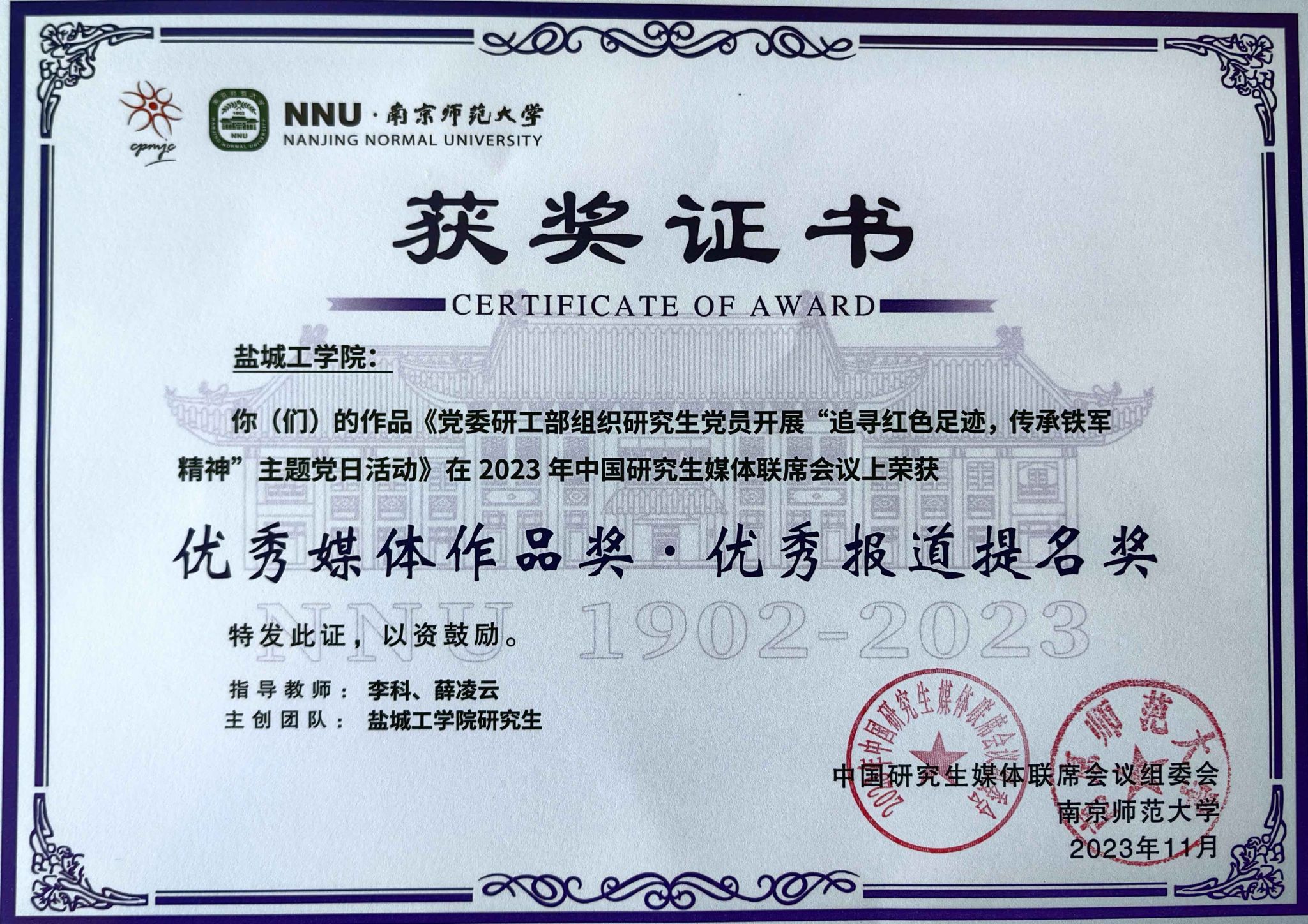 经自主申报、组委会评审、高校互评等环节,我校报送的作品《党委研工部组织研究生党员开展“追寻红色足迹,传承铁军精神”主题党日活动》荣获优秀媒体作品奖·优秀报道提名奖、《盐城工学院研究生教育》荣获媒体嘉年华优秀竞展奖,实现了我校研究生教育媒体作品获奖零的突破。