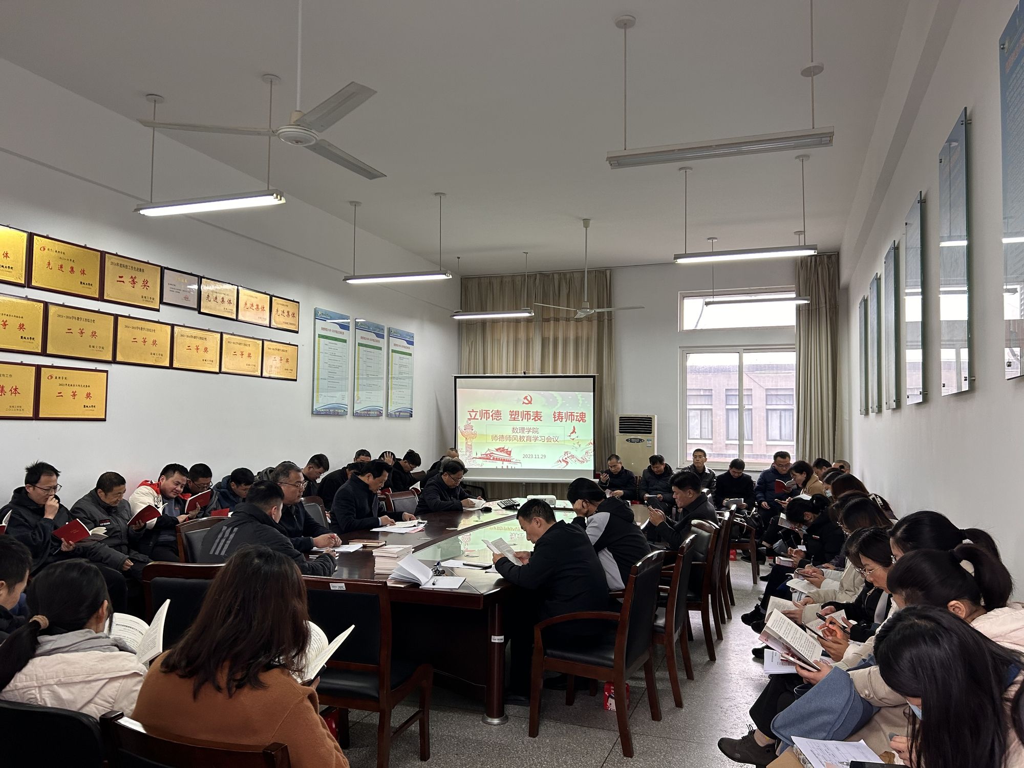 11月29日下午,数理学院在南校区博学楼B512会议室举办师德师风专题学习活动暨教职工政治理论学习会,院长薛长峰主持,全院教职工参加。