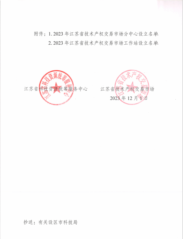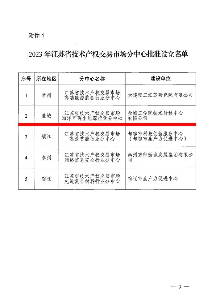 12月1日,江苏省科技资源统筹服务中心联合江苏省技术产权交易市场联合下发《关于批准设立2023年江苏省技术产权交易市场分中心和工作站的通知》(省技交〔22023〕8号),盐城工学院技术转移中心有限公司经自主申报、地方科技主管部门推荐、形式审查、专家评审、现场考察、汇报答辩等程序,被认定为“江苏省技术交易市场海洋可再生能源行业分中心”。