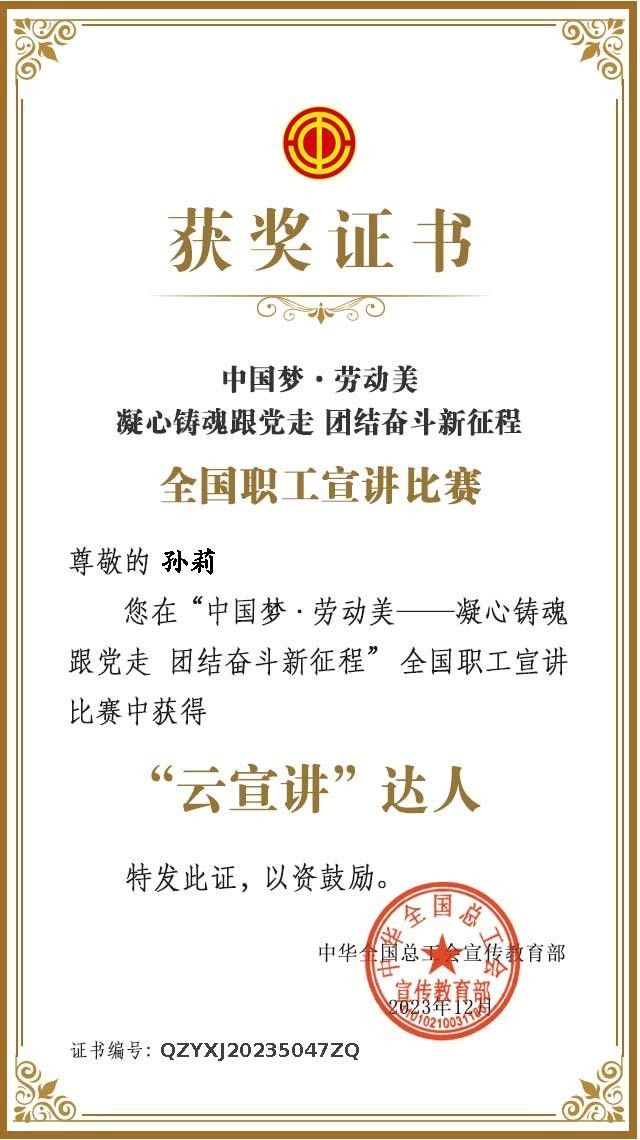 为深入学习宣传贯彻中国工会十八大精神,我校工会积极组织教职工参加“中国梦·劳动美·幸福路——凝心铸魂跟党走 团结奋斗新征程”全国职工宣讲比赛,选送马克思主义学院孙莉、赵迎华、张瑞芹、张成联、蔡云晨等5位教师参赛。经过层层选拔和激烈竞争,孙莉老师荣获中华全国总工会“云宣讲”达人称号。据悉,全国获此称号的仅有1000人。