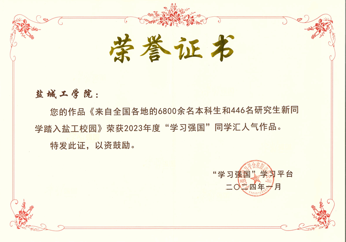 近日,“学习强国”全国平台从2023年同学汇发布的20000余条内容中,精选出200条作品,根据投票结果评选出人气作品Top100。我校作品《来自全国各地的6800余名本科生和446名研究生新生踏入盐工校园》入围。1名同志被评为优秀管理员。