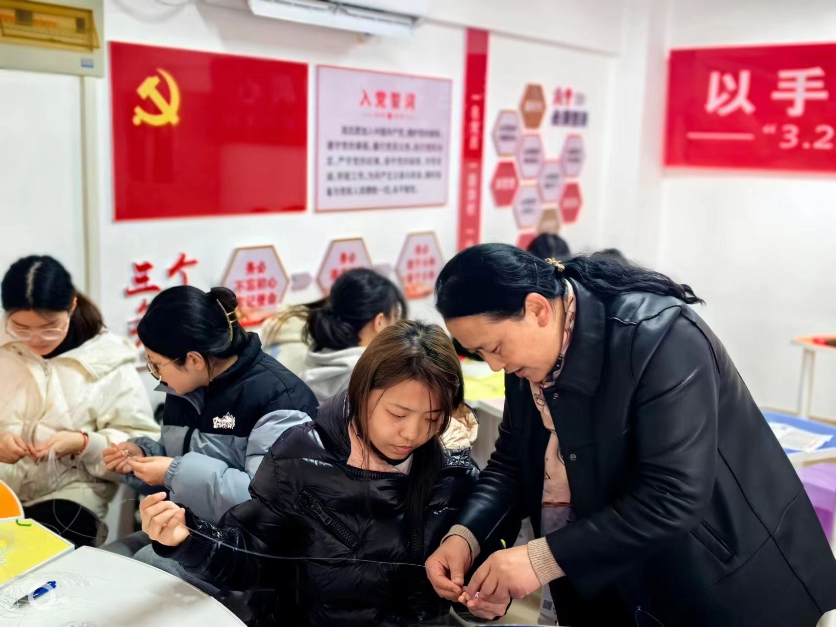 活动中,徐新华首先向在场同学演示了四角珠编织的操作过程、制作要点,随后带领大家从基础步骤开始一步步制作。在她的细心指导下,同学们认真专注地编织着自己的作品。徐新华告诉大家,四角珠的编织能够帮助参与者增强耐心和专注力,培养手眼协调能力和美术绘画能力,提升参与者的自信和心理健康。同时,希望大家珍惜当下来之不易的学习生活环境,以阳光心态、健康体格开启青春筑梦新征程。