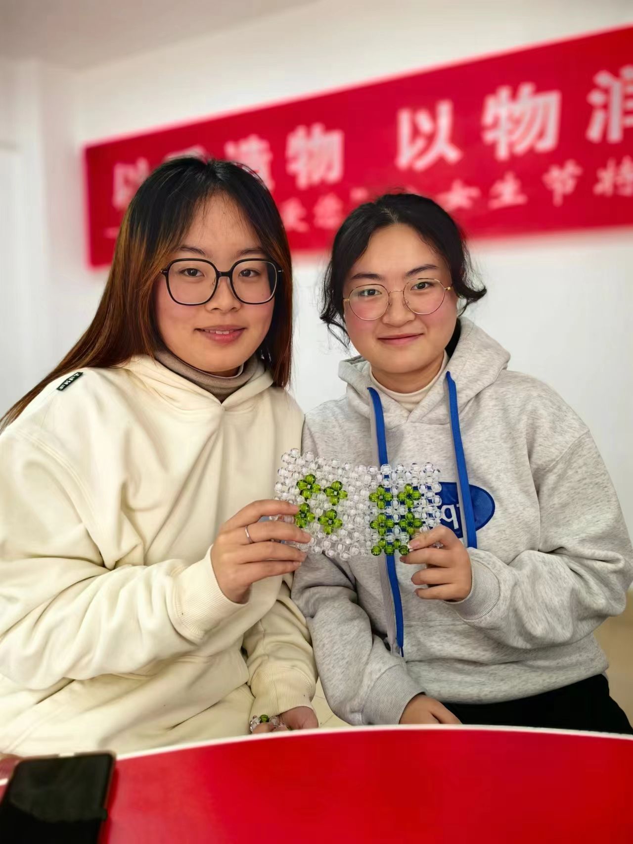 “第一次接触串珠手作,对于不擅长手工制作的我来说有些难度,看徐老师制作感觉很简单,但自己上手时就会遇到各种问题,好在徐老师特别有耐心,手把手教我如何串珠,如何接头,看着自己完成的作品还是很有成就感的!”参与活动的女同学说着展示起自己编好的隔热垫,喜笑颜开。