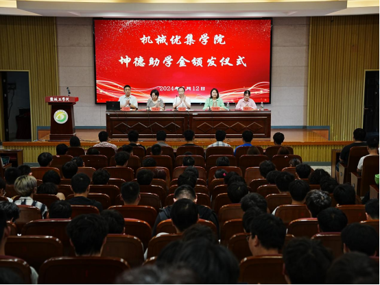 会上,陈淑云宣读《关于颁发盐城工学院机械优集学院“坤德助学金”的决定》,学院领导和企业向受资助的学生颁发证书及助学金,B智造212李鹏鹏代表受资助同学发言。