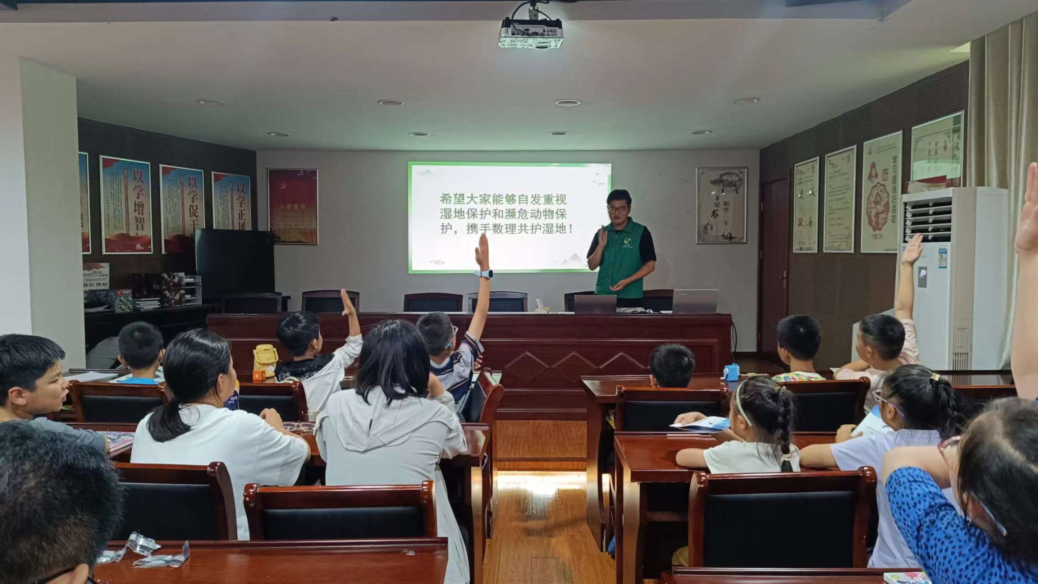 同时,志愿者们通过精心制作的纪录片和PPT,集中展示了近年来盐城湿地修复和生态文明建设成果,并就湿地的定义、类型、分布和功能等内容向孩子们进行了详细讲解。讲解过程中,志愿者们还设置了抢答环节,让孩子们在互动中进一步加深了对湿地科普知识的理解和记忆。