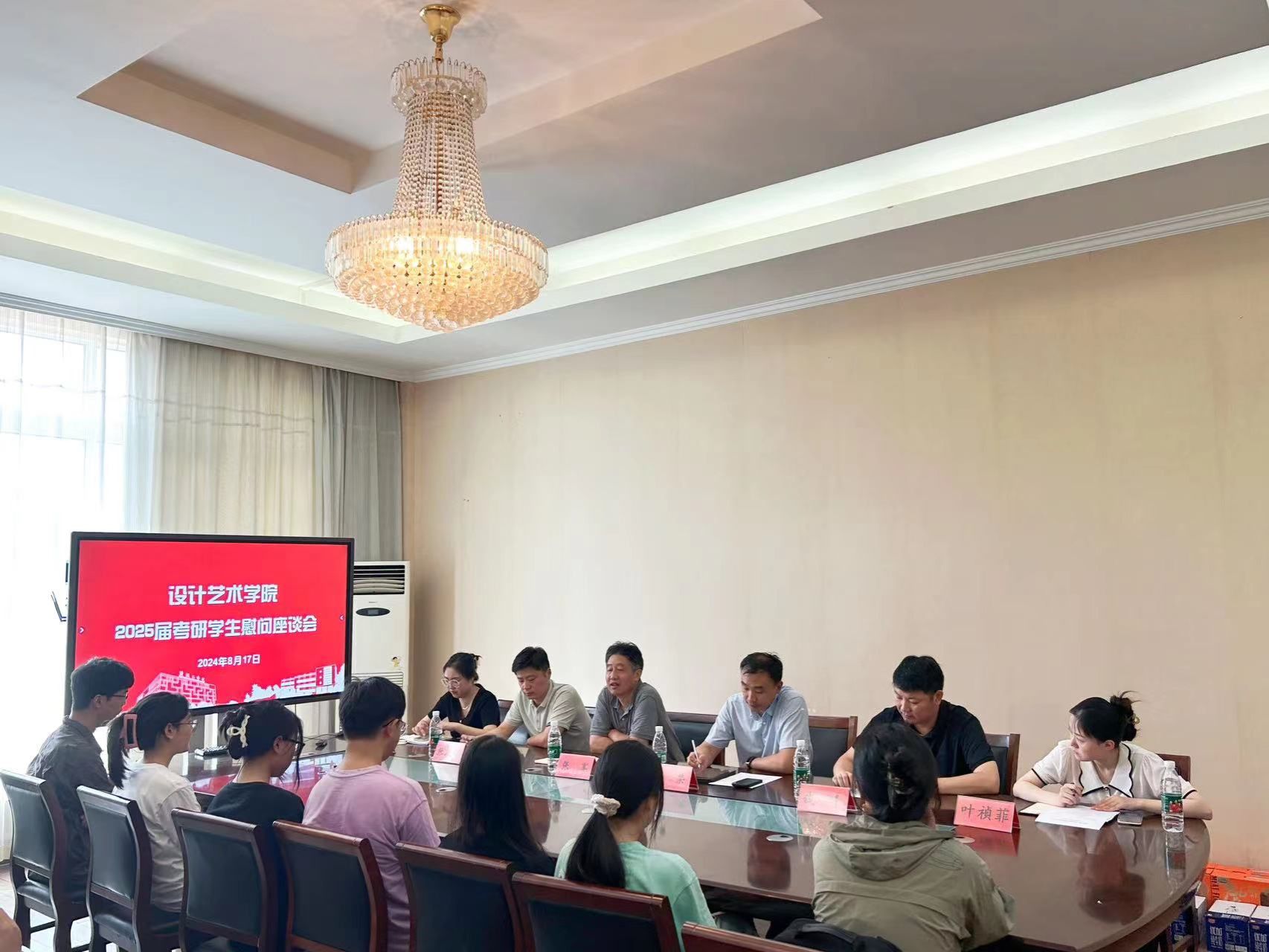 为了解暑期留校考研学生的学习和生活状态,增强学生考研信心,提高备考效率,8月17日上午,设计艺术学院在润美楼A311会议室召开2025届暑期留校考研学生慰问座谈会,院长张军、党总支书记刘荣、产品设计系主任钱峰、学工办副主任顾清、分团委副书记叶禎菲及留校考研学生代表参加。会议由党总支副书记张庆领主持。