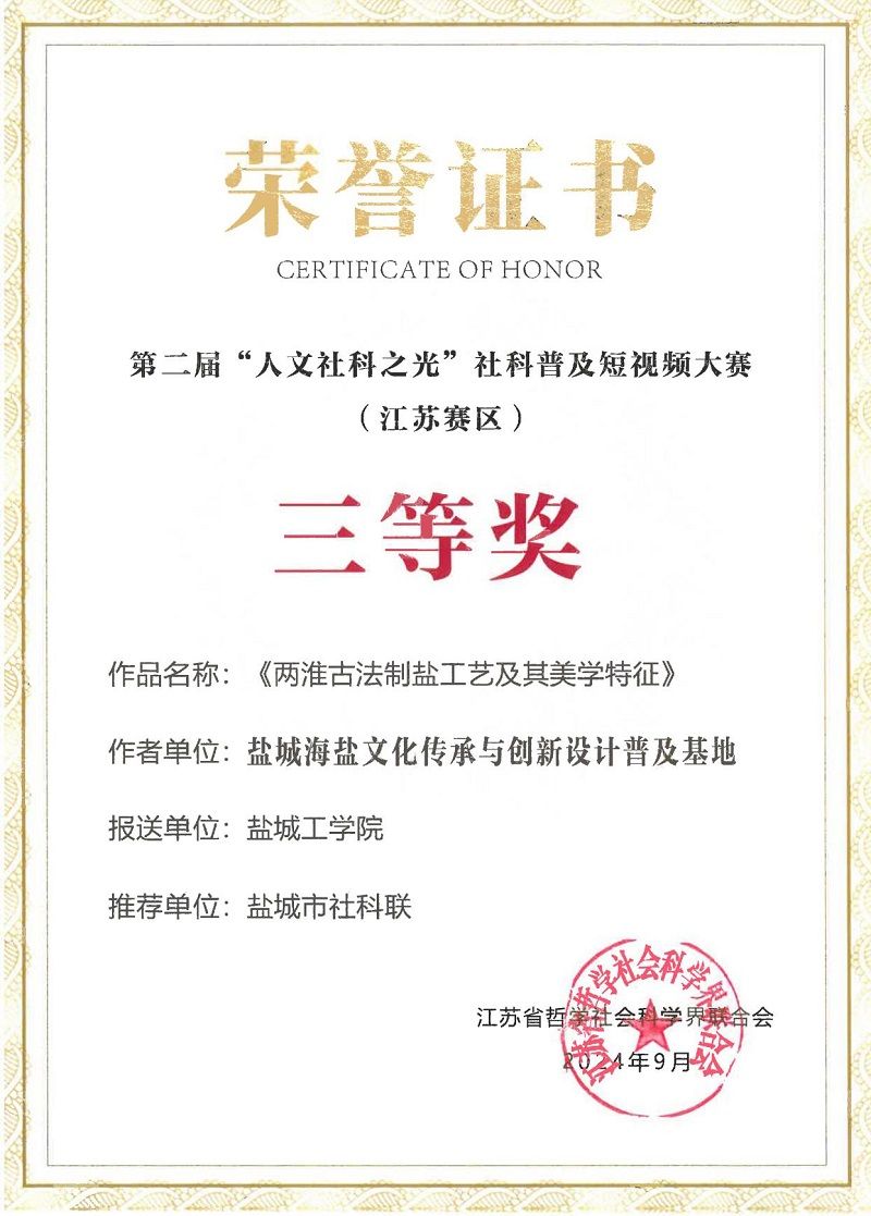 近日,由江苏省社科联主办的第二届“人文社科之光”社科普及短视频大赛落下帷幕,由我校报送的设计艺术学院、盐城海盐文化传承与创新设计普及基地张军、戚凤国二位教师的作品《两淮古法制盐工艺及其美学特征》,经盐城市社科联推荐,从全省众多优秀作品中脱颖而出,荣获三等奖。该作品是我校省社科普及基地建设的阶段性成果。