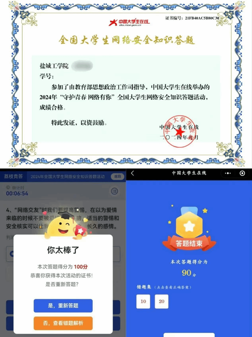 此外,针对大一新生,学院特别推荐了“守护青春 网络有你”全国大学生网络安全知识答题活动,鼓励他们在9月9日至20日期间积极参与。活动一经发起,同学们便迅速响应,积极参与答题。他们表现出对网络安全知识的高度兴趣和关注,认为这是一次提升自我防护能力的好机会。通过线上答题的方式,学生们不仅巩固了所学网络安全知识,还进一步提升了安全用网、善于用网、文明上网的能力素养。