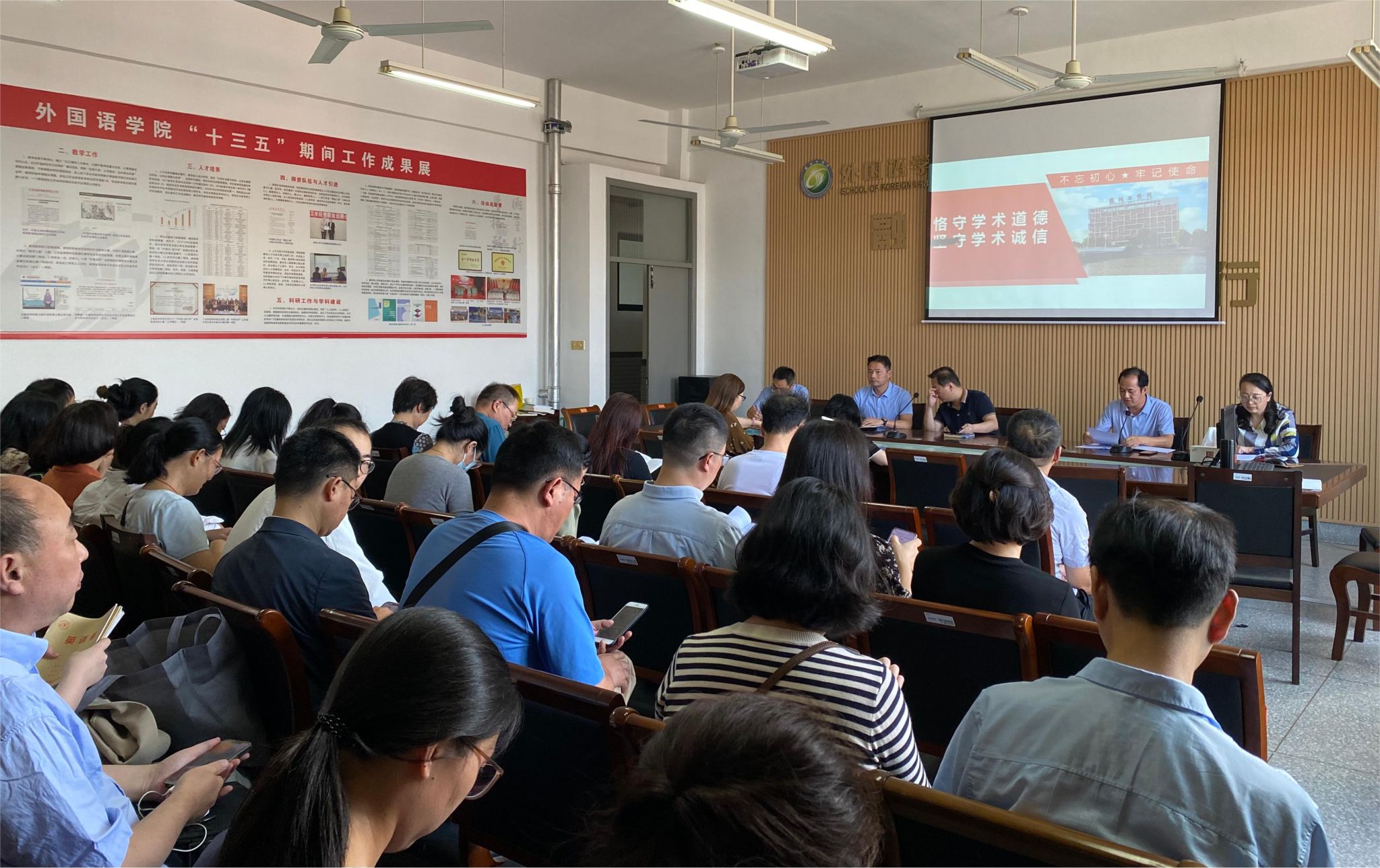 为进一步加强师德师风建设,提升教师职业道德素养,营造风清气正的教育教学环境,9月25日下午,外国语学院在南校区润美楼四楼学院会议室召开师德师风建设专题学习会。院长叶磊、党总支书记刘正华,副院长吴斌、周学恒,党总支副书记倪璞出席会议,学院全体教师参加。