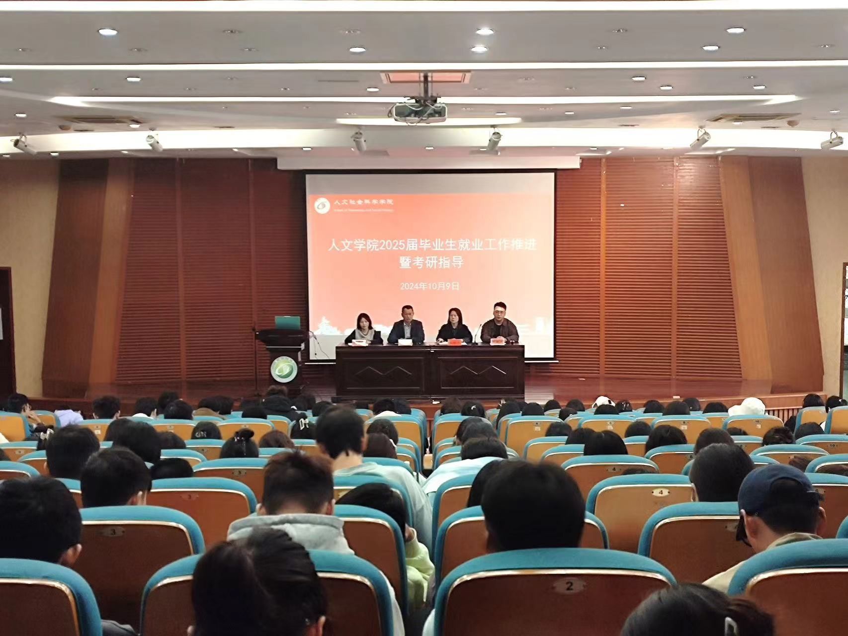 为进一步推动2025届毕业生的就业与考研进程,激发同学们的就业与考研热情,并帮助他们了解当前的就业与考研形势,10月9日下午,人文学院在南校区润美楼报告厅举办2025届毕业生就业工作推进暨考研指导会。学院党总支书记何登溢、党总支副书记姚爱华、学工办主任魏语婷,毕业班辅导员许建文及全体2025届毕业生参加会议。