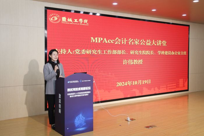 10月19日上午,由中国会计学会、全国会计专业学位研究生教育指导委员会主办,盐城工学院经济管理学院承办的MPAcc教育20周年活动——MPAcc会计名家公益大讲堂在盐城工学院西伏河产学研协同创新中心一楼报告厅举行。本次MPAcc会计名家公益大讲堂邀请了财政部会计名家、中国政府会计准则委员会咨询专家、中国人民大学博士生导师赵西卜教授与学院师生分享题为《跨界会计》的报告。党委研究生工作部部长、研究生院院长、学科建设办公室主任许伟教授主持活动,经济管理学院党政领导、会计学系教师以及MPAcc23级和24级研究生参加。
