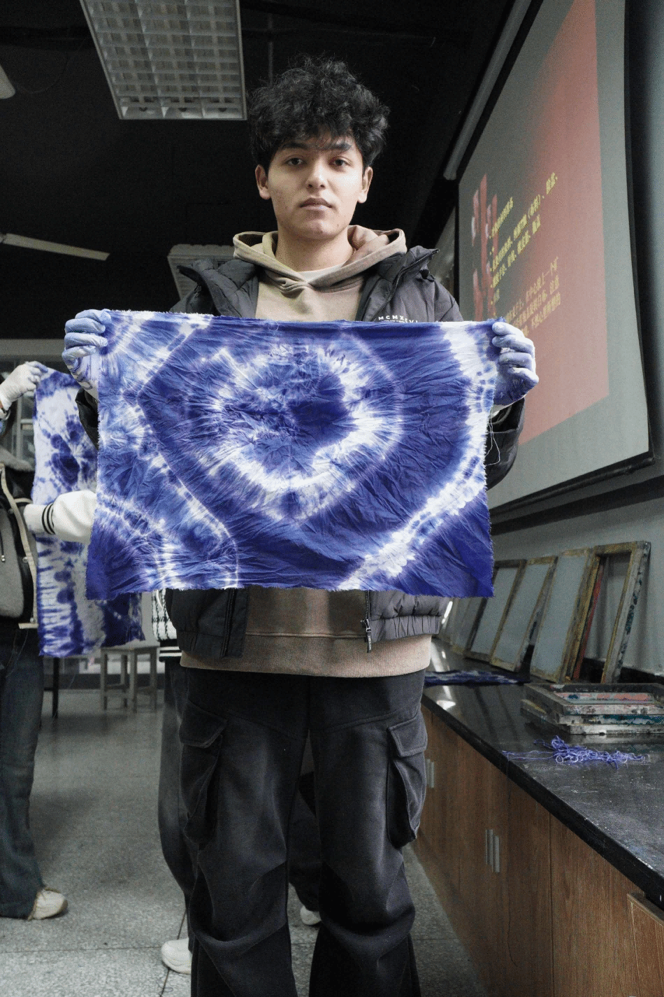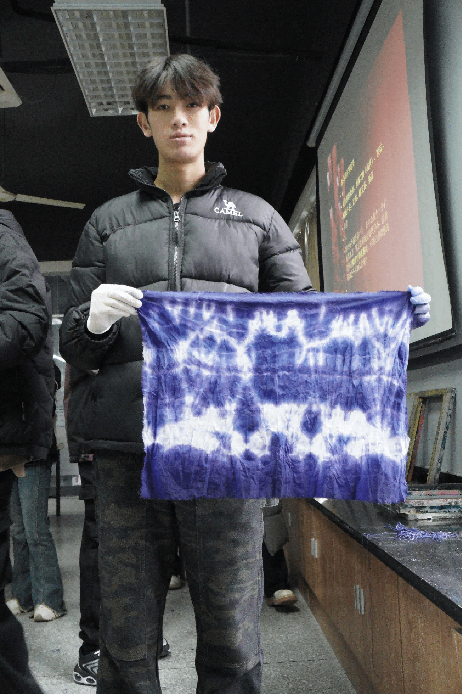 在动手实践环节,同学们将一块块洁白的布料通过折叠、绑扎、浸染等一系列工序,开启了属于自己的扎染创作之旅。整个创意与设计实验中心弥漫着浓郁的创作氛围,欢声笑语与专注认真的神情交织在一起,构成了一幅别样的画面。