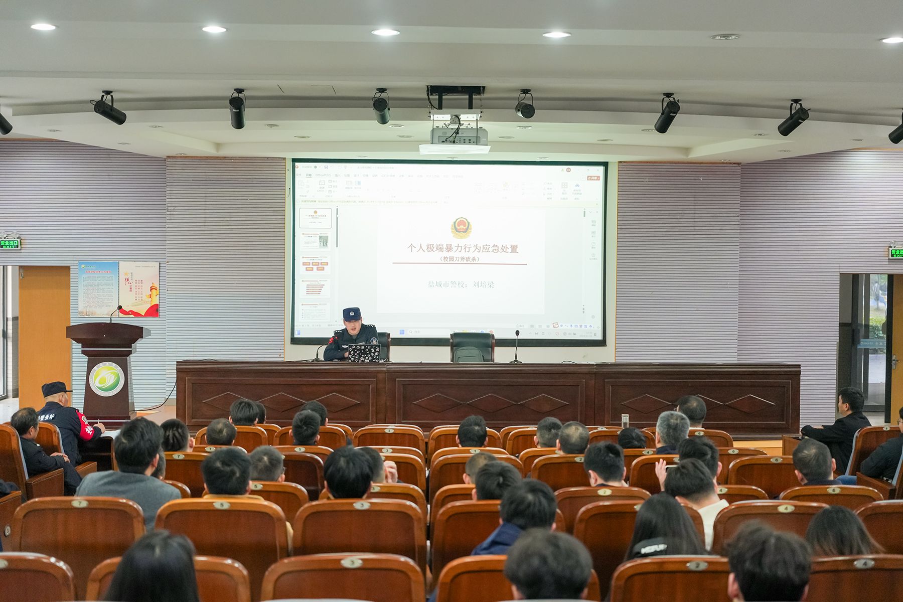 为切实提升防暴处突的认知水平,增强学校应对突发校园暴力事件的处置能力,确保校园环境安全和谐,保障全体师生的生命安全和正常的教育教学秩序,11月21日下午,盐城市公安局亭湖分局在我校土木馆报告厅开展专题培训和应急演练。盐城市公安局亭湖分局社区民警、安保处安保人员、辅导员代表和主要学生干部代表等80余人参加培训。