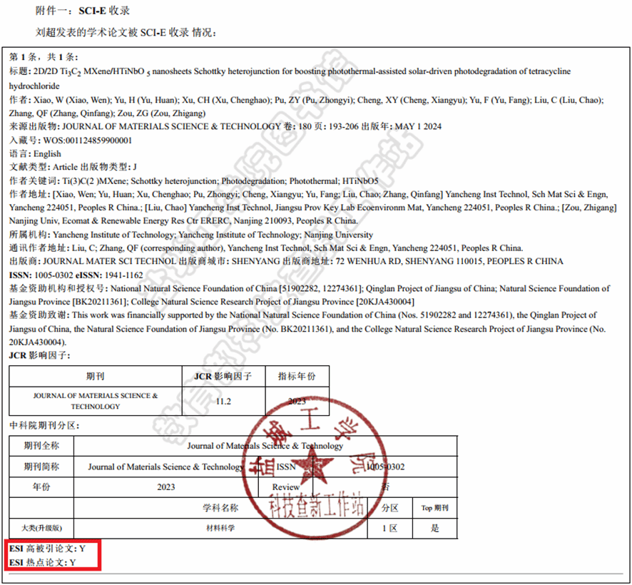 近期,根据Essential Science Indicators (ESI)数据库检索结果显示,我校材料学院研究生肖雯(第一作者)、刘超博士(通讯作者)和张勤芳教授(通讯作者),盐城工学院为第一单位发表在Journal of Materials Science & Technology(中科院一区Top,影响因子:11.2)的研究论文“2D/2D Ti3C2 MXene/HTiNbO5 nanosheets Schottky heterojunction for boosting photothermal-assisted solar-driven photodegradation of tetracycline hydrochloride”(J. Mater. Sci. Technol., 2024, 180, 193-206),被同时收录为ESI材料学科“高被引论文”(Highly Cited Papers)和“热点论文”(Hot Papers)。