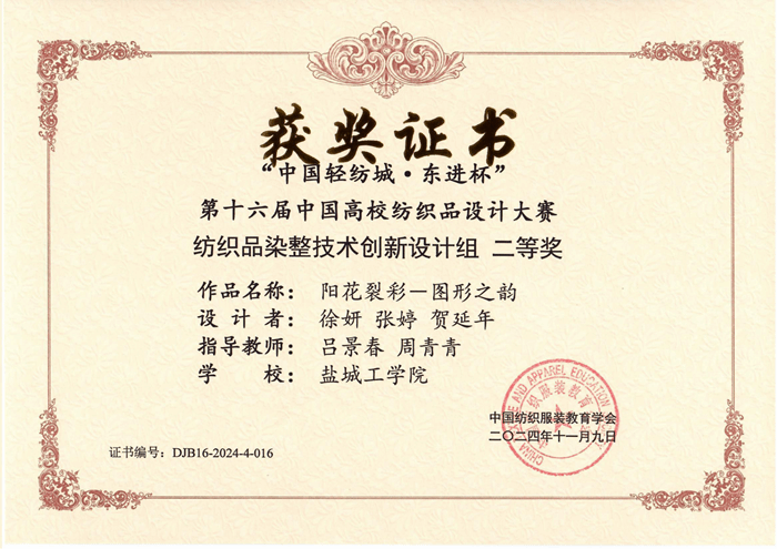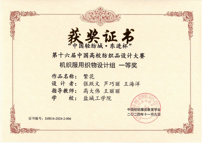 近日,2024年“中国轻纺城·东进杯”第十六届中国高校纺织品设计大赛的获奖名单揭晓。纺织服装学院在此次大赛中表现优异,共获奖34项,其中一等奖2项、二等奖9项、三等奖23项。
