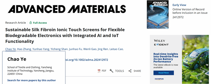 近日,纺织服装学院叶超博士与上海科技大学合作在国际材料学科顶尖期刊Advanced Materials上发表题为“Sustainable Silk Fibroin Ionic Touch Screens for Flexible Biodegradable Electronics with Integrated AI and IoT Functionality”的研究成果(DOI:https://doi.org/10.1002/adma.202412972)。这是纺织服装学院首次学院教师为第一作者、盐城工学院为第一通讯单位在Advanced Materials期刊(IF=27.4)上发表高水平研究论文,标志着学院的前沿学术科研水平不断增强,人才队伍建设效果明显。该工作获得了国家自然科学基金及盐城工学院高层次人才科研启动项目的资助。