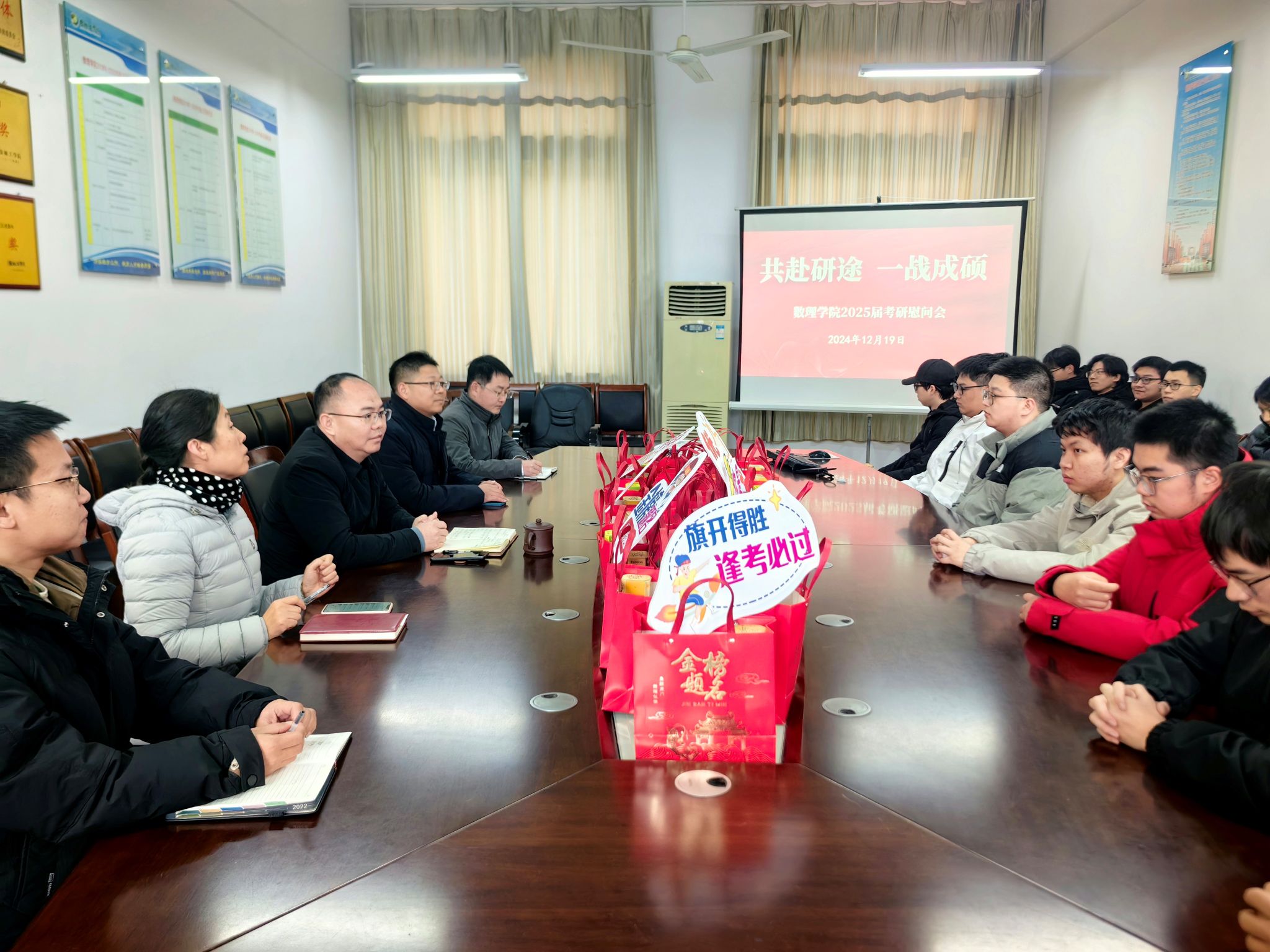 2025年全国硕士研究生招生考试日期将至,为鼓舞考研士气,坚定考研信心,传递温暖力量,12月19日下午,数理学院在博学楼B512开展“共赴研途,一战成硕”考研慰问活动。党总支书记魏伟华、党总支副书记许众威、学工办主任孙杰、团委副书记陈亚雷、辅导员黄小钢以及2025届考研学生参加。