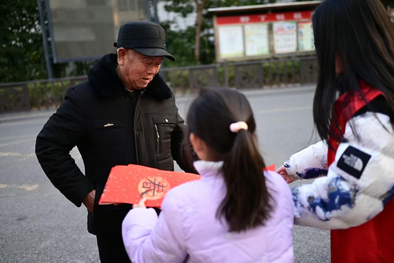 气候虽寒,但热情不减。活动现场吸引了众多居民,我校青年伏案挥笔,寄情水墨,现场为他们创作春联和花鸟画作品。当地居民拿着新鲜的春联仔细端详,止不住的赞赏,夸赞同学们写得好,写得有活力。