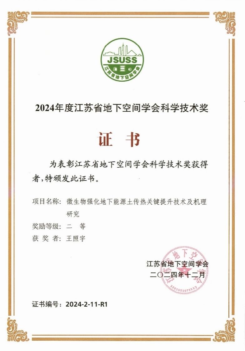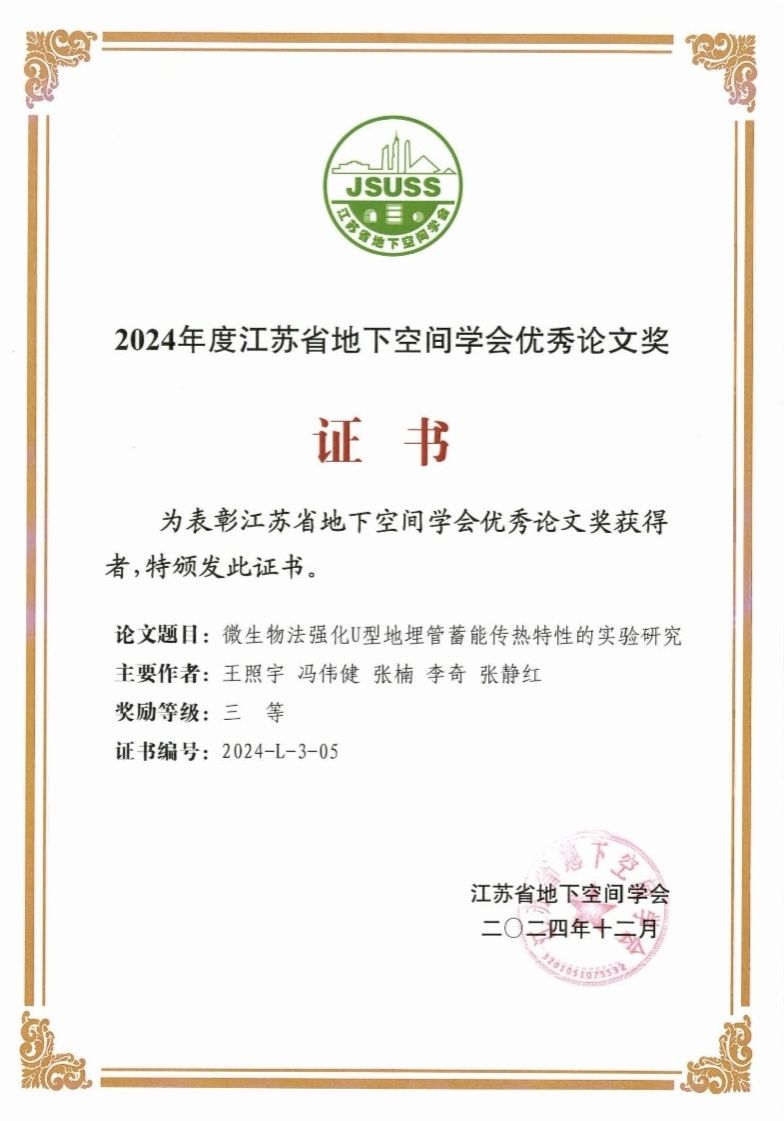 大会颁发了2024年度江苏省地下空间学会科学技术奖,由李富荣牵头申报的“面向行业发展的岩土与地下工程人才培养探索实践”获软科学研究类一等奖,王照宇团队牵头申报的“微生物强化地下能源土传热关键提升技术及机理研究”获技术发明和技术开发类二等奖,王照宇团队完成的“微生物法强化U型地埋管蓄能传热特性的实验研究”获优秀论文三等奖。会议期间,李富荣介绍了我校城市地下空间工程专业建设、人才培养、参与学会活动情况,并与参会的相关高校及企业的领导、专家进行了充分交流。