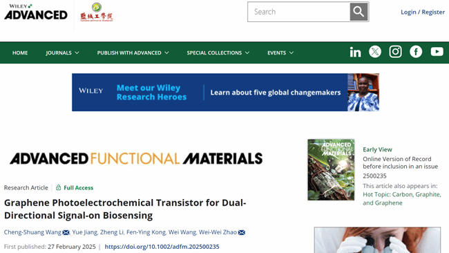 近日,我校材料科学与工程学院王成双教授联合南京大学赵伟伟教授在材料领域顶级期刊Advanced Functional Materials(中科院一区Top,影响因子18.5)上发表题为Graphene Photoelectrochemical Transistor for Dual-Directional Signal-on Biosensing的研究论文(DOI: 10.1002/adfm.202500235),盐城工学院为第一署名单位,王成双教授为论文的共同第一/通讯作者,硕士研究生姜悦为共同第一作者,分析化学与新能源研究所王伟教授和孔粉英教授提供了重要指导。