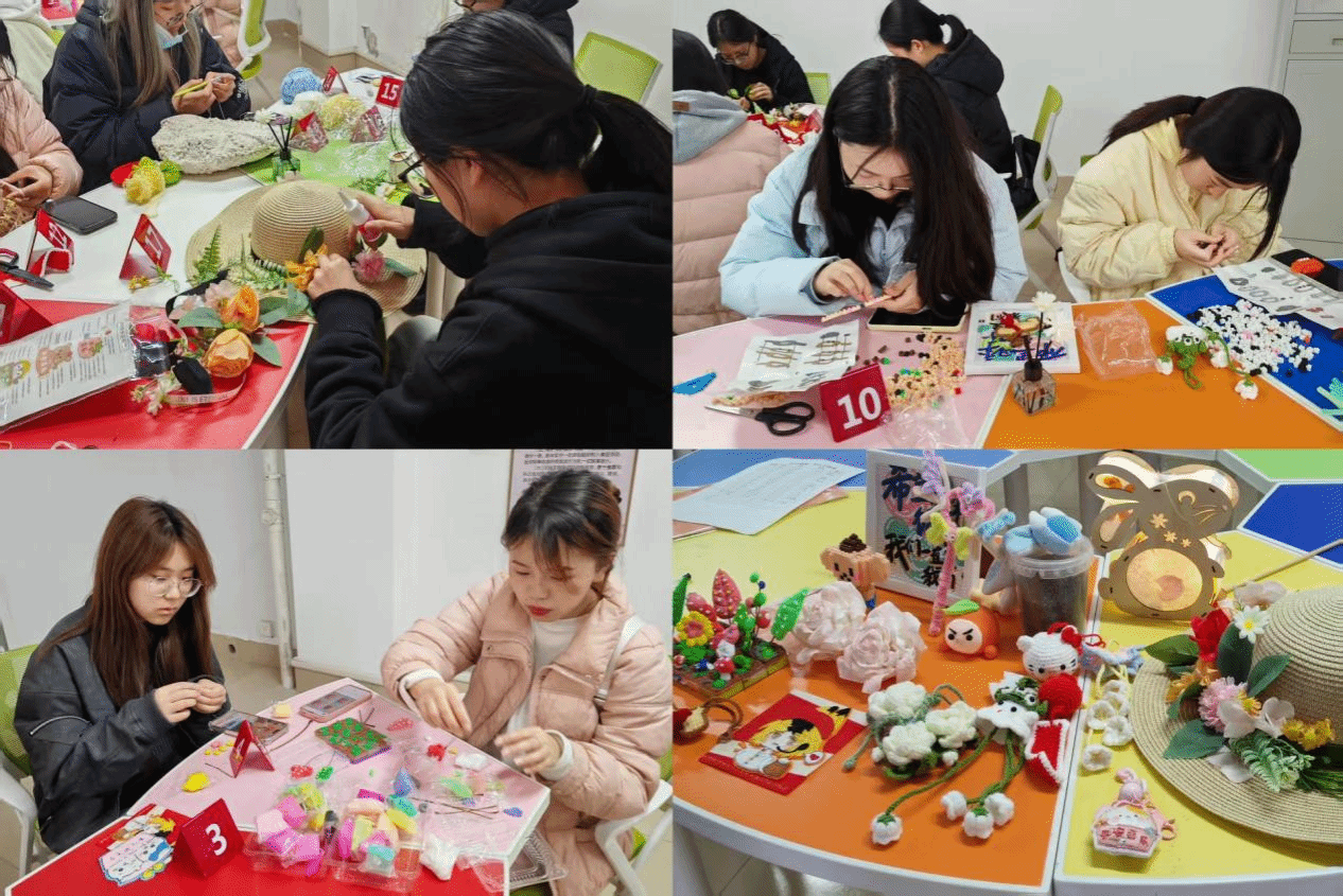 活动现场,一张张桌子被精心布置,上面摆满了各式各样的手工材料,每一件都表达了同学们的用心与期待。同学们围桌而坐,充分发挥自己的想象力和创造力,灵巧的双手在材料间穿梭,一个个精美的作品逐渐成形。有的同学全神贯注地编织着细腻的毛线作品,手法娴熟,色彩斑斓;有的同学则小心翼翼地拼接着手中的黏土,每一个细节都凝聚着他们的心血与热爱。现场氛围热烈而温馨,充满了欢声笑语。