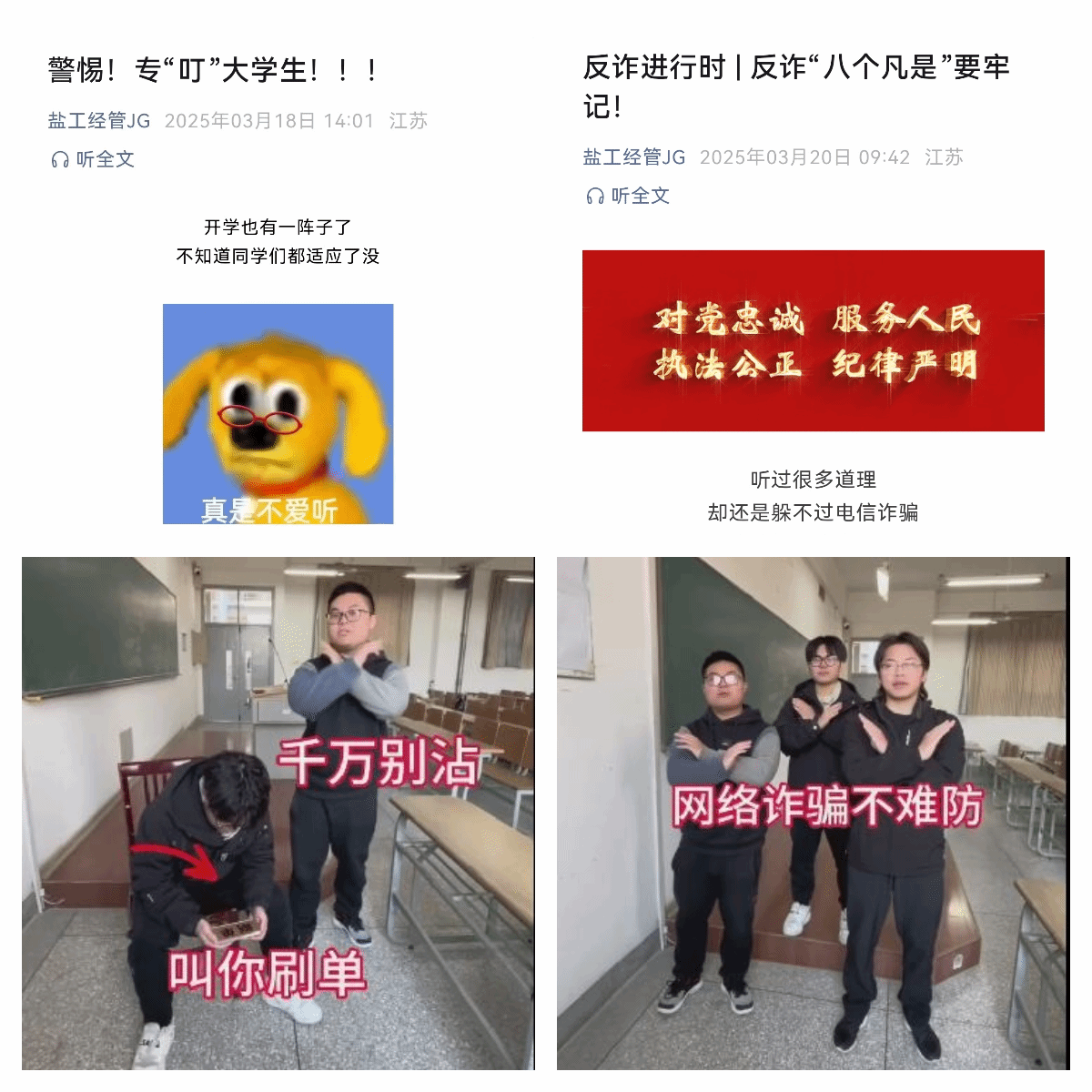 打造"线上+线下"立体传播矩阵,“盐工经管JG”微信公众号开设反诈专栏“反诈进行时”,定期发布反诈内容。学生自编自导自演“防范诈骗”情景剧,以幽默演绎还原"冒充客服退款"等诈骗场景。组建反诈先锋队,发挥学生主动能动性,开展反诈知识竞赛,推动宣传教育从"单向灌输"转向"双向互动"。