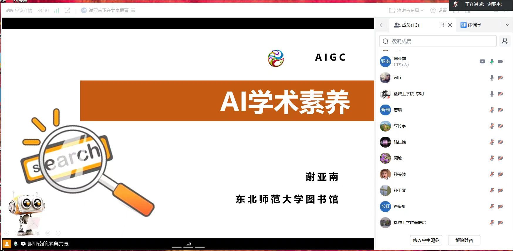 为提升图书馆教师团队的AI学术素养与AI教学能力,推动文献检索课程与人工智能技术的深度融合,3月23日晚,图书馆特邀东北师范大学图书馆谢亚南研究馆员通过雨课堂平台联动腾讯会议的线上形式,作题为《AI学术素养》的专题培训讲座。文献检索教研部全体教师、科技查新工作站工作人员等参加培训,图书馆馆长李明主持。
