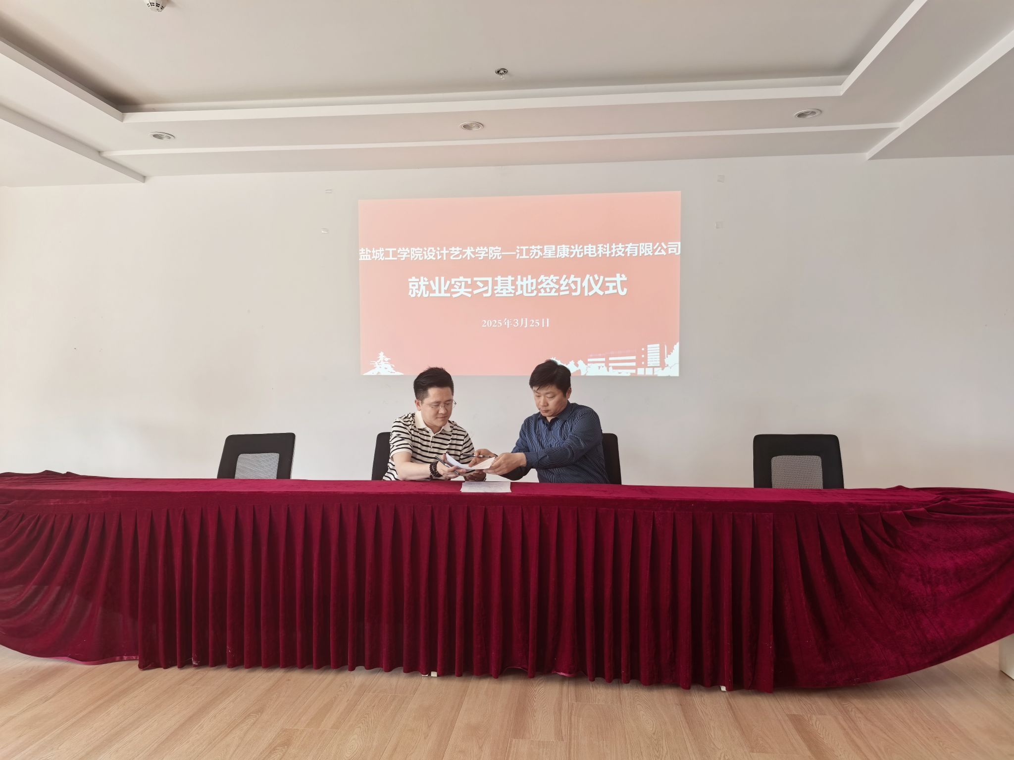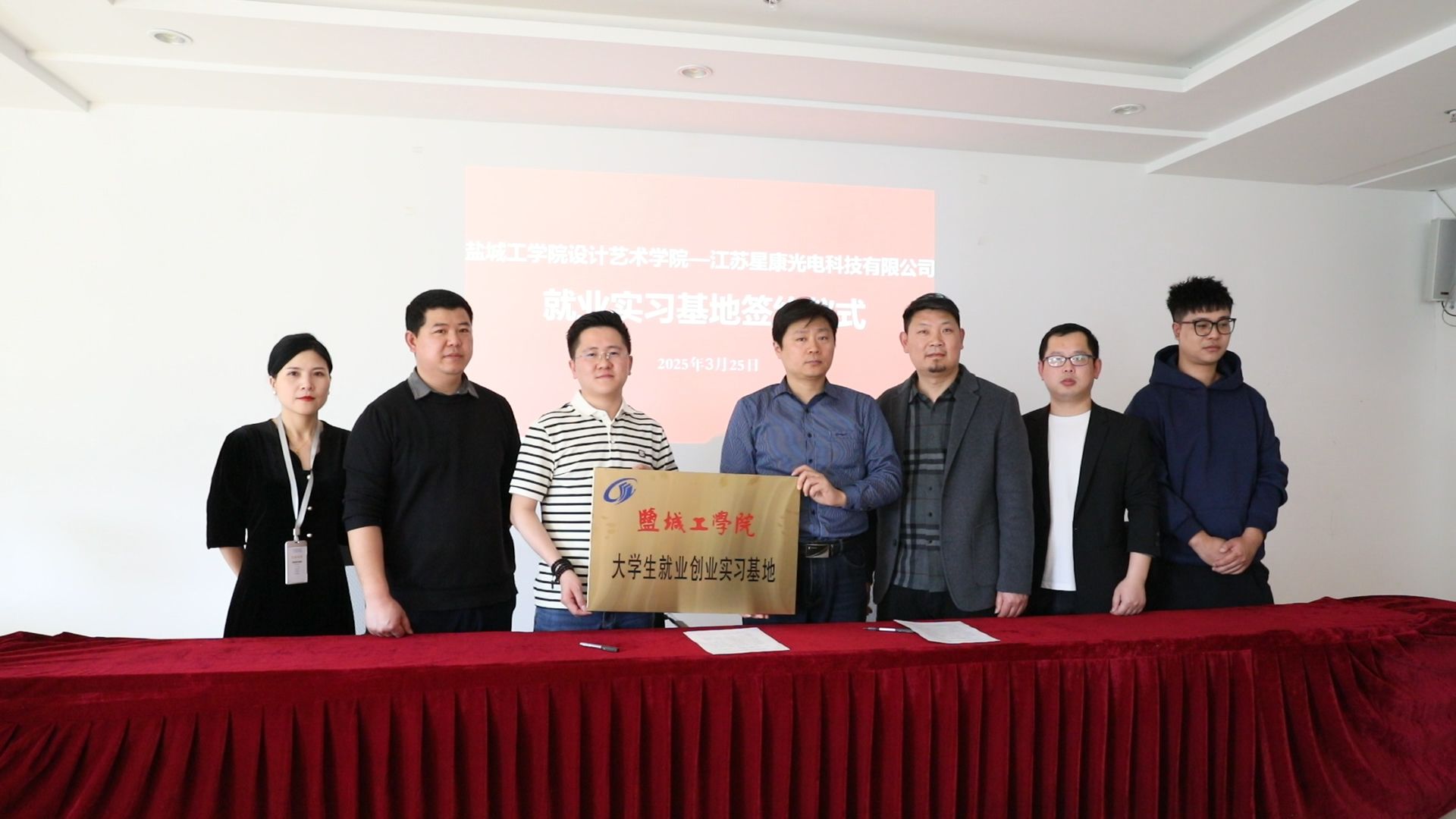 江苏星康光电科技有限公司董事长景伟热情接待张庆领一行。他详细介绍了企业远景目标、业务领域、员工成长发展等情况,并表示愿意为学校提供充足的实习岗位和就业机会,帮助学生提升动手实践能力和岗位适应能力。张庆领在认真听取了企业对人才培养的建议和具体招聘需求后表示,将以此次调研为契机,持续深化校企合作,创新人才培养模式,为企业发展提供人才支撑。同时,他希望企业能够继续支持学院发展,共同为培养高素质技术技能人才、服务产业转型升级贡献力量。双方还就人才培养、学科建设、校企合作等方面的细节问题进行了深入交流,并签订就业实习基地共建协议,举行“盐城工学院大学生就业创业实习基地”挂牌仪式。