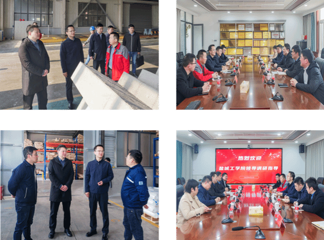 唐浩一行首站来到江苏博拓新型建筑材料股份有限公司、盐城健牌科技有限公司,参观了智能化生产线、数字化生产车间,了解了博拓建材、健牌科技近年发展情况以及产学研需求。双方表示将秉持“资源共享、优势互补、互利共赢”原则,精确对接企业需求,加强产学研深度合作以及人才培养方面的沟通交流,共同探索校企合作新模式。