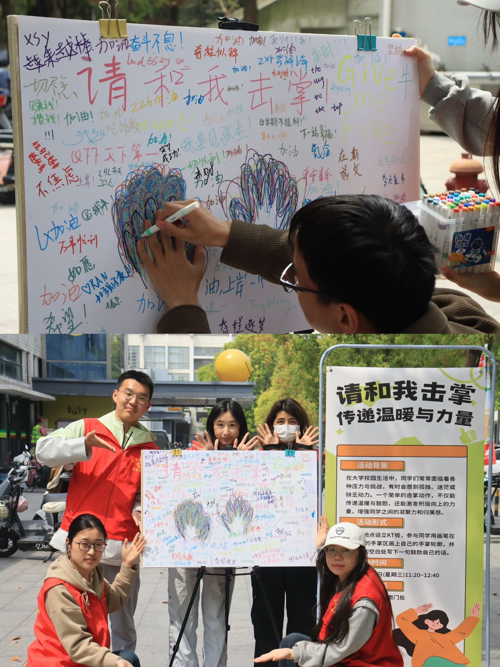 “请和我击掌”画板上数百枚手掌印交织成独特画卷,“奋斗不息”“不负青春”“the way to the top”等话语既承载着每位盐粒子对自己的期许与鼓励,也传递着他们对生活的热爱与积极向上的态度。