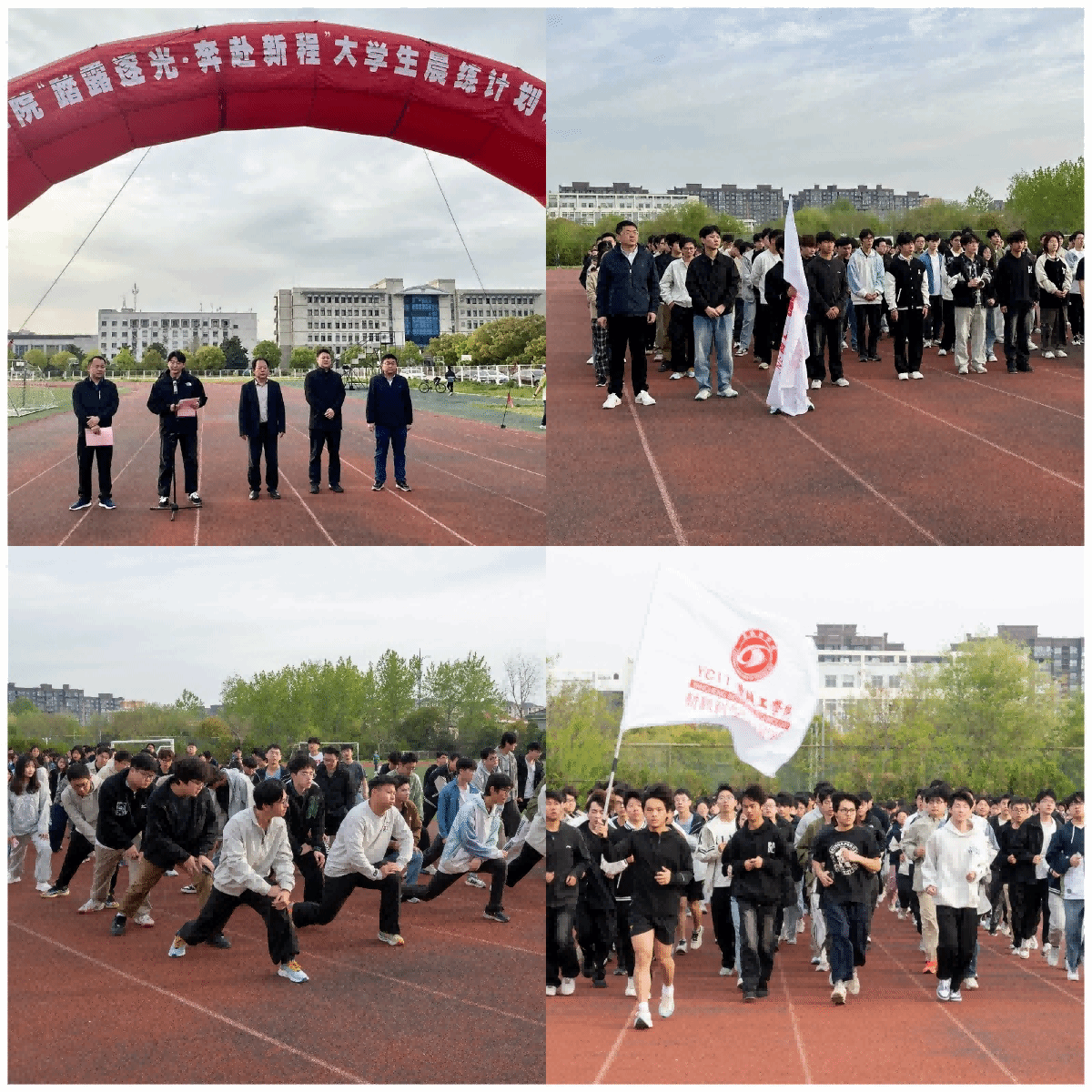 唐浩对全体学生提出殷切期望,鼓励大家以积极饱满的态度参与晨练,将持之以恒的精神转化为个人成长进步的强大动力,并宣布晨练正式启动。在院旗的引领下,学生们沿着足球场跑道有序开跑,晨练的项目丰富多彩涵盖跳绳、踢毽子、踢足球、俯卧撑等运动项目。