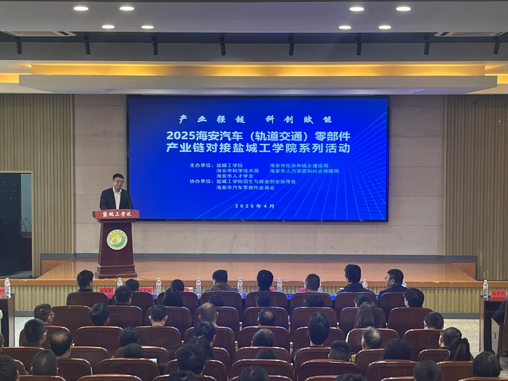 为进一步深化校地交流合作,实现融合联动、合作共赢的“双向奔赴”,4月16日上午,汽车工程学院与海安市住建局等单位在南校区机械馆报告厅联合举办“产业强链·科创赋能”盐城工学院对接海安汽车(轨道交通)零部件产业链系列活动。海安市政协副主席、汽车(轨道交通)零部件产业链链长陈锦璜,我校汽车工程学院院长刘玮、党总支书记陈青、党总支副书记丁德惠出席活动,海安市发改委、住建局等相关部门负责人、近40家汽车零部件企业代表、汽车工程学院师生代表等200余人参加。
