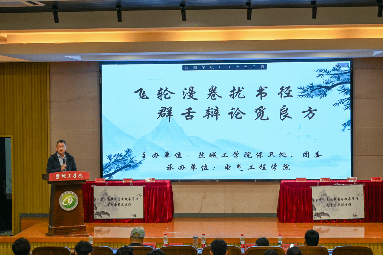 4月27日晚,学校在南校区机械馆报告厅举办校园电动车管理主题辩论赛。安保处处长李义峰、人文社会科学学院党总支书记何登溢、汽车工程学院党总支书记陈青、团委副书记胥爱国、电气工程学院党委副书记江滔出席并担任评委,各二级学院学生代表近300人观看比赛。