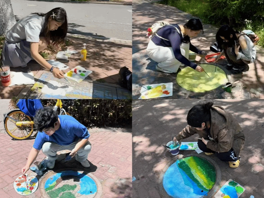 4月26日上午,设计艺术学院将劳动教育与美育相结合,充分发挥专业特长,组织25名学生志愿者,开展“‘井’上添‘画’,落地生‘花’”校园井盖美化活动。活动以二十四节气为主题,将校园井盖变身“文化画布”,用创意与色彩装点校园,传递传统文化之美。参与的同学历经清理井盖、构图打稿、调色绘制等多道工序,以二十四节气为创作主线,将春生、夏长、秋收、冬藏的时序之美融入井盖设计。立春的嫩芽与纸鸢、清明的细雨、芒种的麦浪、冬至的饺子,一个个节气通过同学们的手绘跃然于井盖之上,展现自然韵律,让冰冷的井盖“活”起来,成为校园里的文化名片,同学们也在活动中提升了专业能力,体会到劳动的价值与合作的乐趣。