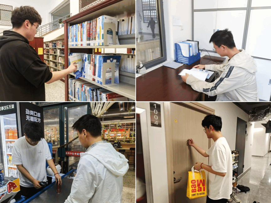 学院组织学生分组沉浸式体验校内后勤岗位。在图书馆,同学们化身“图书管理员”扫码归类书籍;在宿舍服务站,协助工作人员爬楼检修设备、分发物资;在校内超市,B会计241班陈松首次担任收银员,手忙脚乱中打翻购物篮,却收获顾客的暖心鼓励。B信管241班黄子豪顶着烈日骑行配送,体验校园外卖员生活,途中因颠簸洒出汤汁,他主动向顾客道歉并自费补偿,“外卖小哥教会我的不仅是速度,更是责任。”