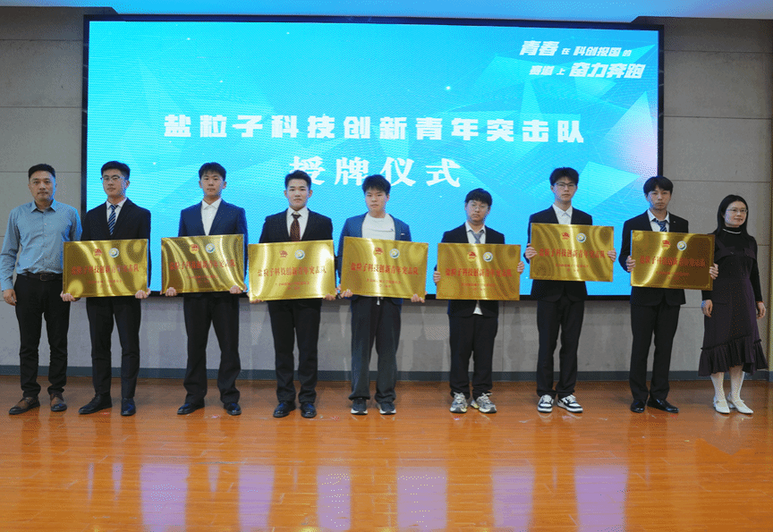 活动中,杨秀丽、胥爱国共同为机械优集学院“气动精播”团队、纺织服装学院“因材施用”团队等七支大学生科创团队颁发“盐粒子科技创新青年突击队”牌。