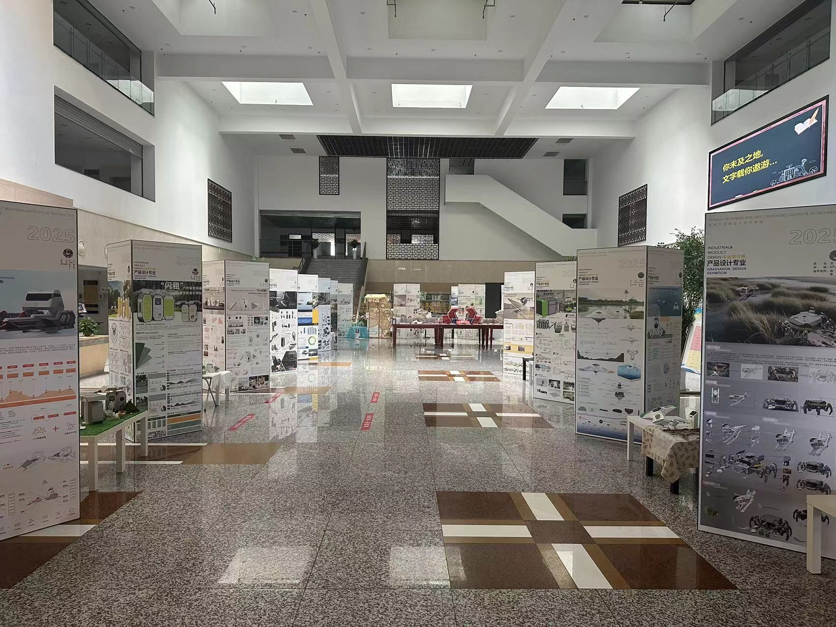 5月12日,我校设计艺术学院2025届产品设计专业毕业设计展在南校区图书馆二楼中庭开幕。本次展览将持续9天,主题是“制器载道•设计向新”,展出该专业近三十组学生作品。为做好本次展览,图书馆突破传统服务边界,将中庭空间改造为“沉浸式设计实验室”,依托图书馆建筑特色,通过无隔断的通透视野,打造出集作品展示、互动体验、学术交流于一体的复合空间。