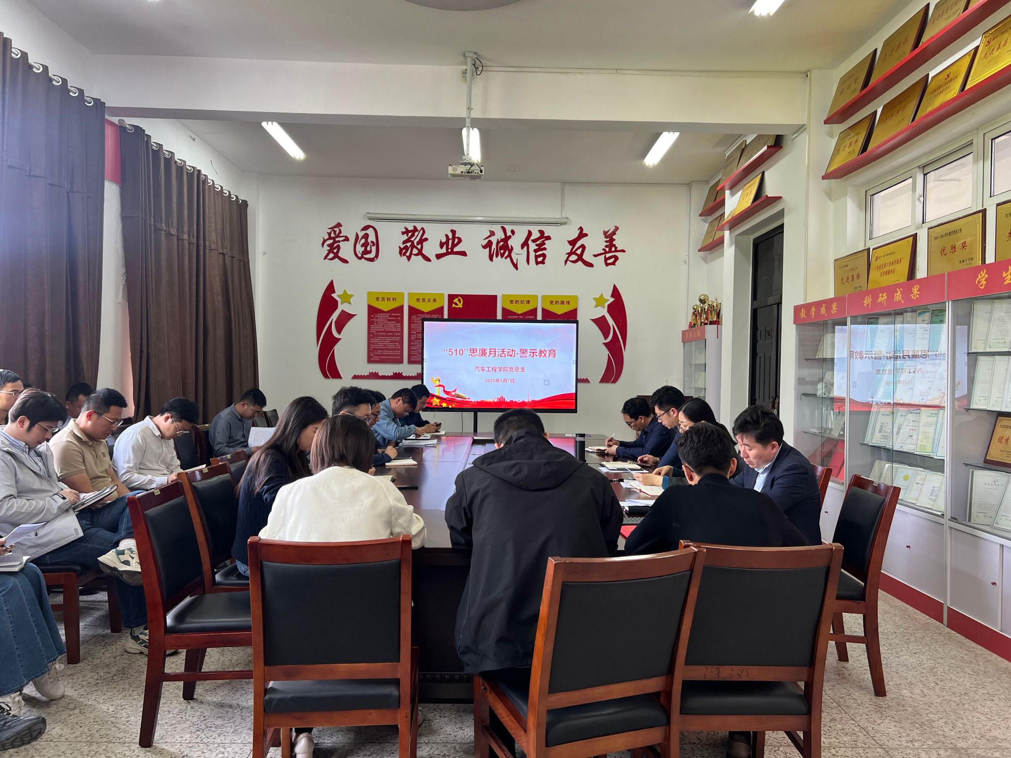 为深入推进校园廉洁文化建设,增强教职工廉洁自律意识,5月7日下午,在希望大道校区机械馆A323会议室,汽车工程学院组织开展“510”思廉月警示教育活动。会议由学院党总支书记陈青主持,学院全体教职工参加。