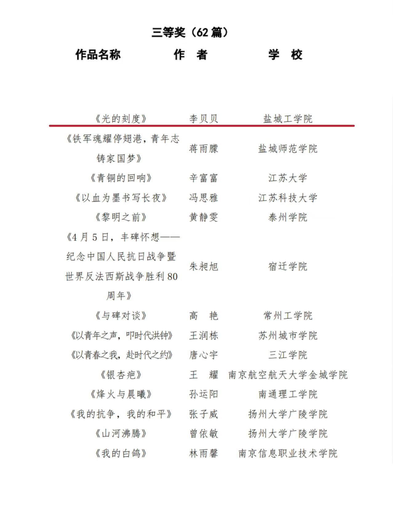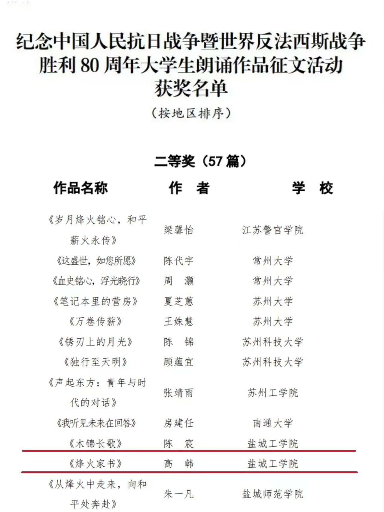 近日,由江苏省学校美育协会、江苏省大学生艺术团联合会主办的 “铭记历史 珍爱和平” 纪念中国人民抗日战争暨世界反法西斯战争胜利 80 周年大学生朗诵作品征文活动结果正式揭晓。我校人文社会科学学院陈宸的作品《木棉长歌》、优培学院高韩的作品《烽火家书》荣获二等奖,汽车工程学院李贝贝的作品《光的刻度》荣获三等奖。
