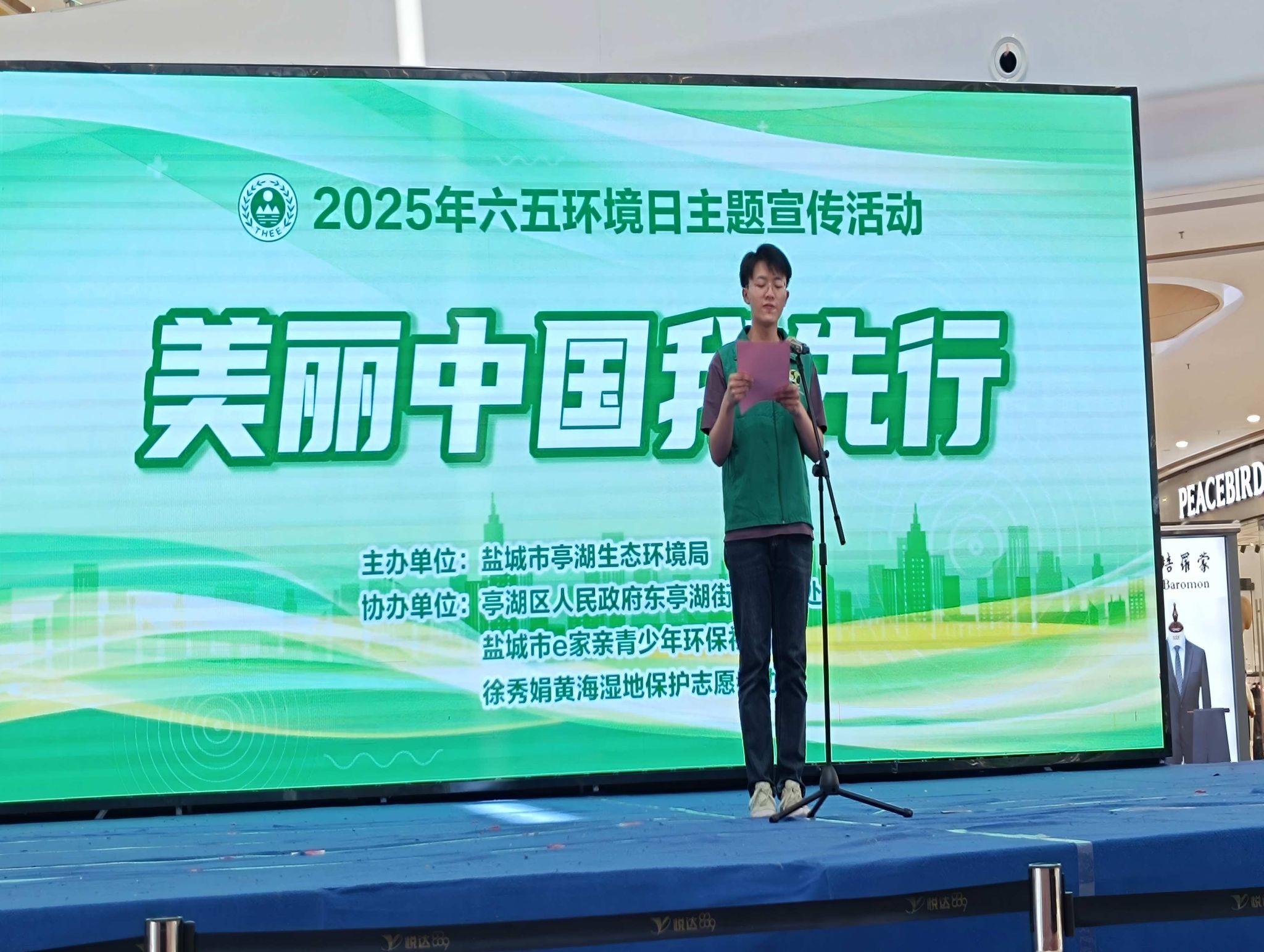 6月5日上午,由盐城市亭湖生态环境局主办,我校徐秀娟黄海湿地保护志愿者协会、东亭湖街道等单位部门共同协办的“美丽中国我先行”2025“六五”世界环境日主题宣传活动在盐城889广场举行。盐城市亭湖生态环境局党组书记、局长孙鸿斌,党组成员、副局长刘荣帮,四级高级主办黄兴阳,东亭湖街道办事处副主任袁玉明,盐城e家亲青少年环保社团负责人刘斌出席。我校数理学院团委副书记陈亚雷、辅导员黄小钢、徐秀娟黄海湿地保护志愿者协会志愿者代表等参加。