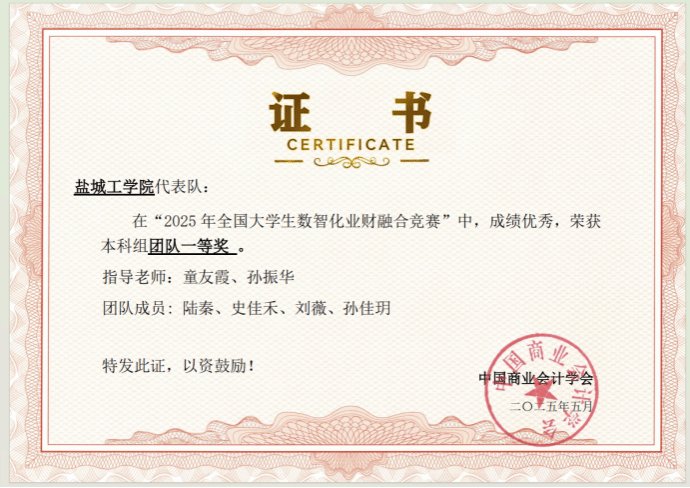 在刚刚落幕的2025年全国大学生数智化业财融合竞赛中,我校经济管理学院学子表现优异,D会计221班刘薇、陆秦、孙佳玥、史佳禾等四位同学组成的团队获得全国总决赛三等奖,区域赛二等奖以及本科组团队一等奖的佳绩,G经管221班高媛媛、陈艳、朱铭、侍佶伟等四位同学组成的团队获得区域赛三等奖的佳绩,本次获奖队伍由会计学系童友霞、孙振华两位教师指导,比赛结果充分展现了经管学院学生在业财融合领域扎实的专业知识和创新的数智化应用能力。